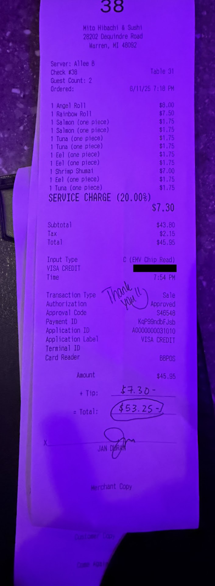 Weâve been regulars here for the half-priced sushi between Tuesday and Thursday â it used to be one of our go-to spots. But after my most recent experience on June 10th, Iâm seriously rethinking that. My bill came to about $43.80, and with tax, tip, and their 20% mandatory service charge, I left a total of $52.25. Later, I found out they charged my card $99.20 â nearly double what I authorized.