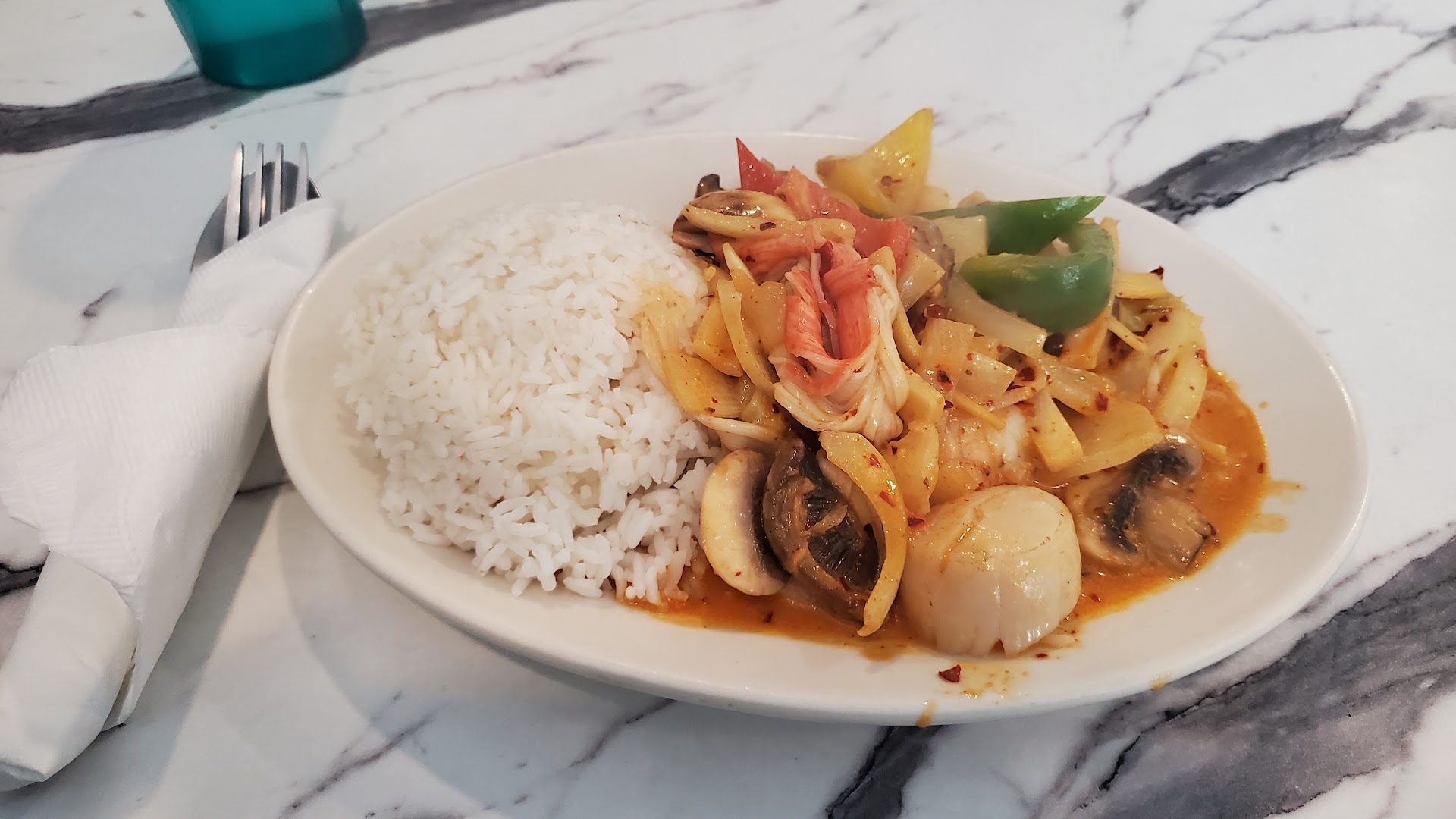 Read moreThey weren't very busy when I entered, just one table with customers and two waiting for carry-out, but there were several empty tables still not cleared. I sat at an empty table that actually still needed wiped down. The lady running the register was also taking orders and cleaning tables. She wiped mine down immediately and returned with water & a menu. Pleasant disposition considering her workload. Menu is extensive, well laid-out and explains all the dishes ingredients, too. Seven levels of spice available: none, mild, mild+, medium, medium+, hot and extra hot. I got the Gang Talay, hot. It arrived less than 5 minutes later. The level of spice right in line with expectations. Great mix of ingredients, not biased toward any. Flavor was good and the dish was cooked properly. Rice was a tiny bit dry but the sauce fixed...
