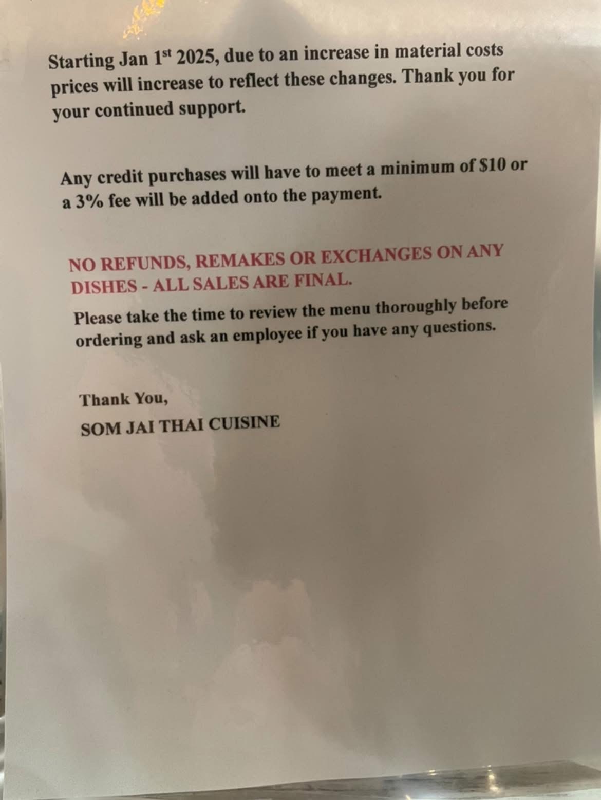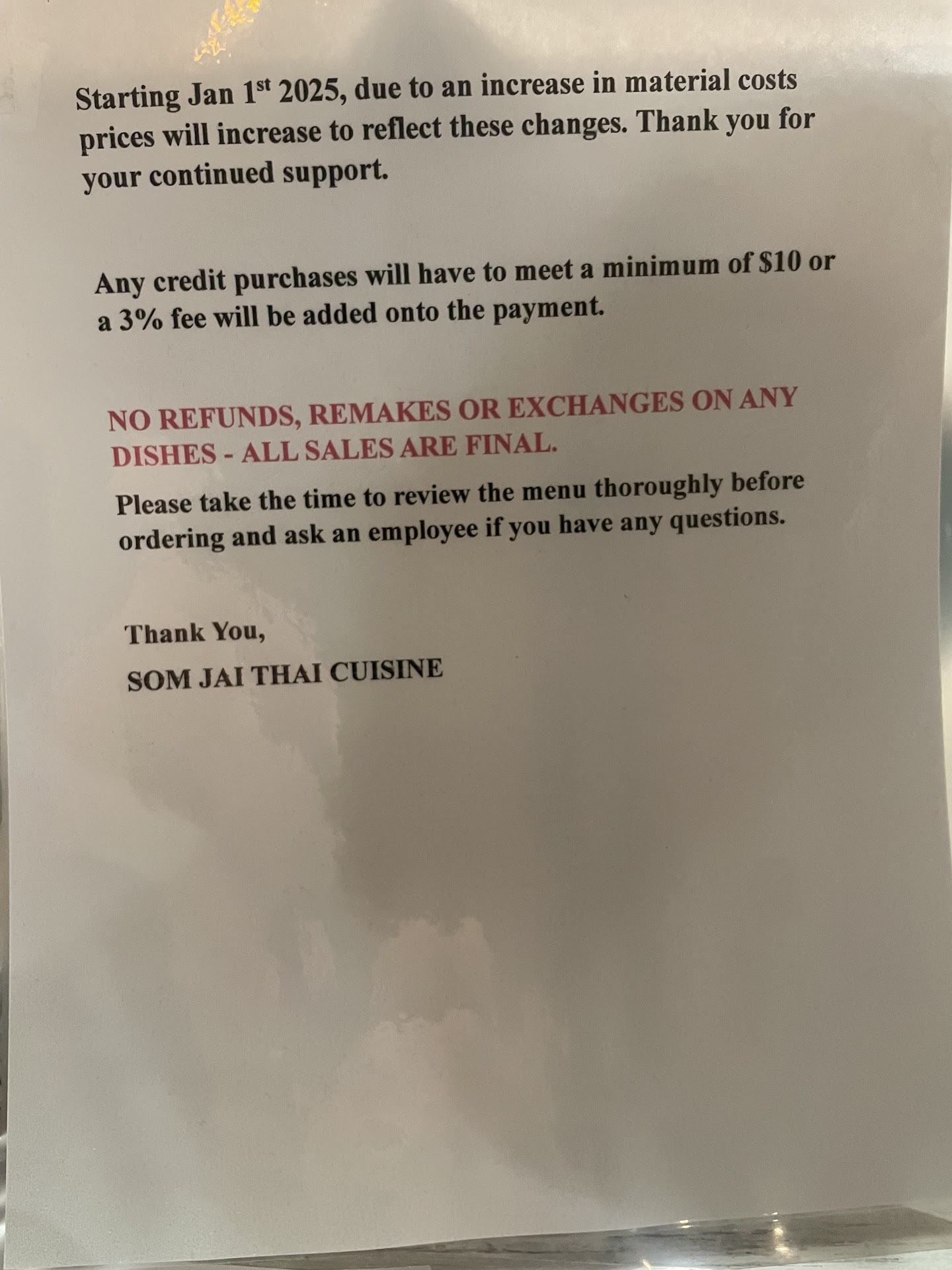 Beware of their no refund, no remakes all sales are final policy! Below is an experience my wife and kids had at Som Jai Thai in Warren. Written from my wife. For some reason it wonât let her leave a review. We have always liked the food from here and enjoyed coming. I actually posted on social media how good they were which I just deleted and made several comments recommending them. Sad that my wife and kids had to experience this. I even went back to try to remedy it but had no luck. The owner pointed to a small piece of paper by the register that states no refunds, remakes, or exchanges, all sales final. Nowhere else is this posted. Itâs not on the menus , or posted at entrance. They said the sign at entrance must of fell. So if you donât sit by the register you wonât see it. Besides, I have never heard of a restaurant have a policy like this. The owner also stated my wife said she didnât eat the dish, so how did she know it tasted bad? Eating a dish and taking 2 bites to taste is a different thing. Bottom line they took the dish back with 2 bites taken out of it and charged my wife for it and refused to refund it even thou it tasted like soap.