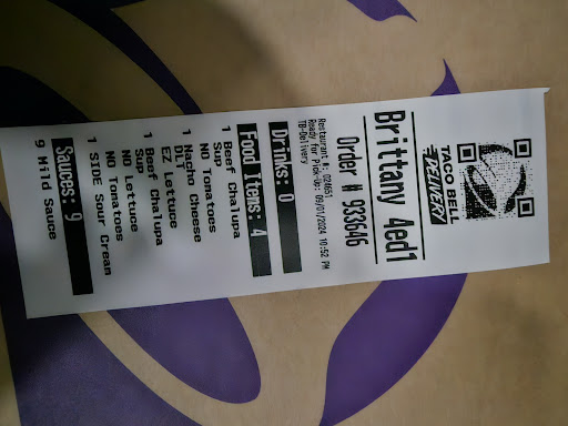Read moreWe did a group order at our workplace, which was 2 meals and 3 smaller food items, and half of our order was missing and not correct. They were out of coffee, and potatoes, hash browns and the food was very sloppy. Also, with all the food I do have an entire bag of hot sauce and one fork. The pop machine is mostly carbonated water. Where they said they could substitute the missing items with others, we ended up not getting either food item. This was my first time going to this one because my usual food place (not Taco Bell) was closed, but honestly, it was not a good experience. I come from the food industry background 10+ years, this would have been completely unacceptable for my previous staff.. I imagine this Taco Bell is working with all younger kids, with no sense of urgency or any sense of pride in their work ethics. I expect bare minimum customer service of double checking the items before you give it away final sale.. Obviously to overachieve is mostly the goal to bring people back. You guys failed at all parts. I wont even call to give you the chance to right the...
