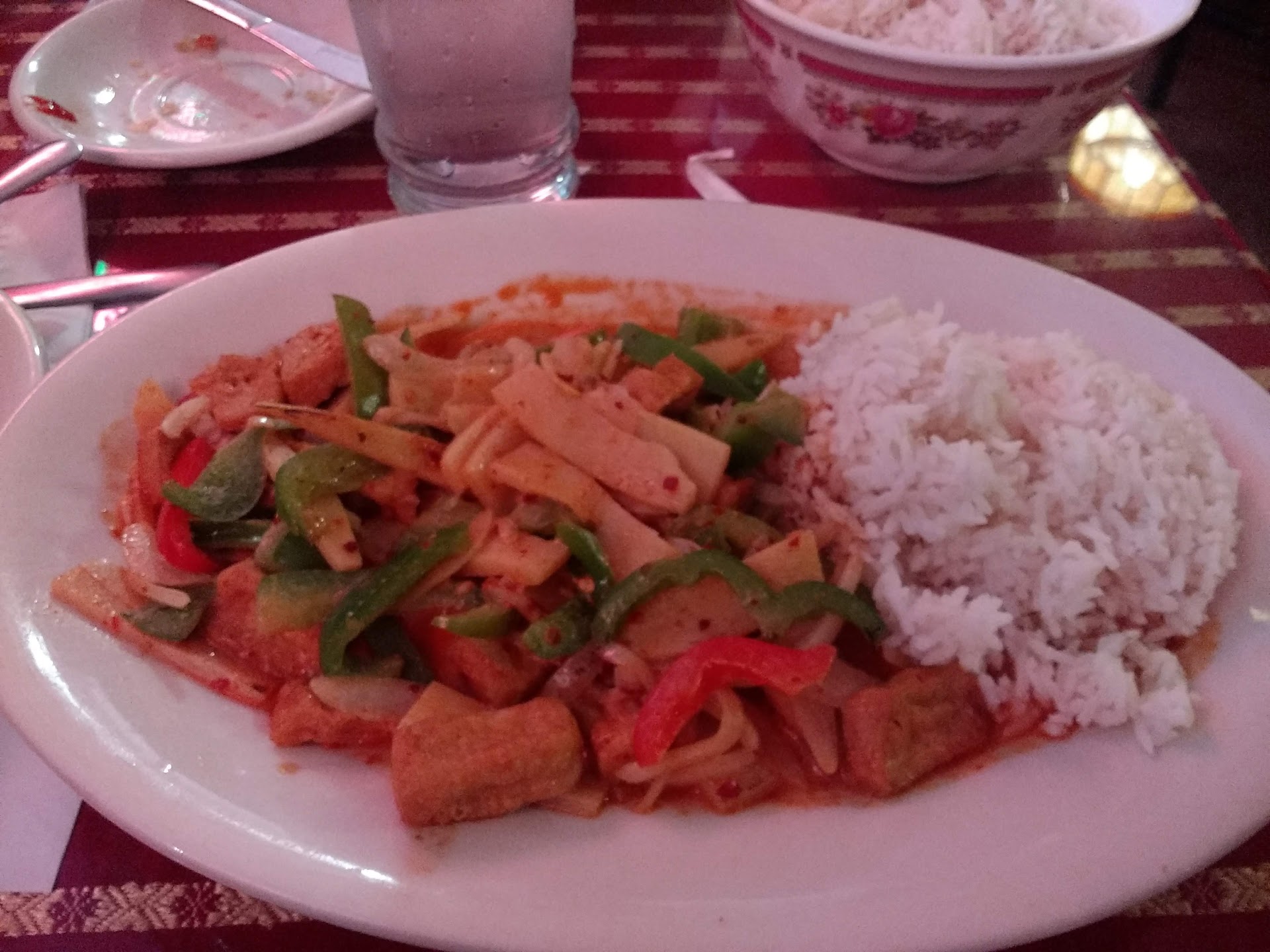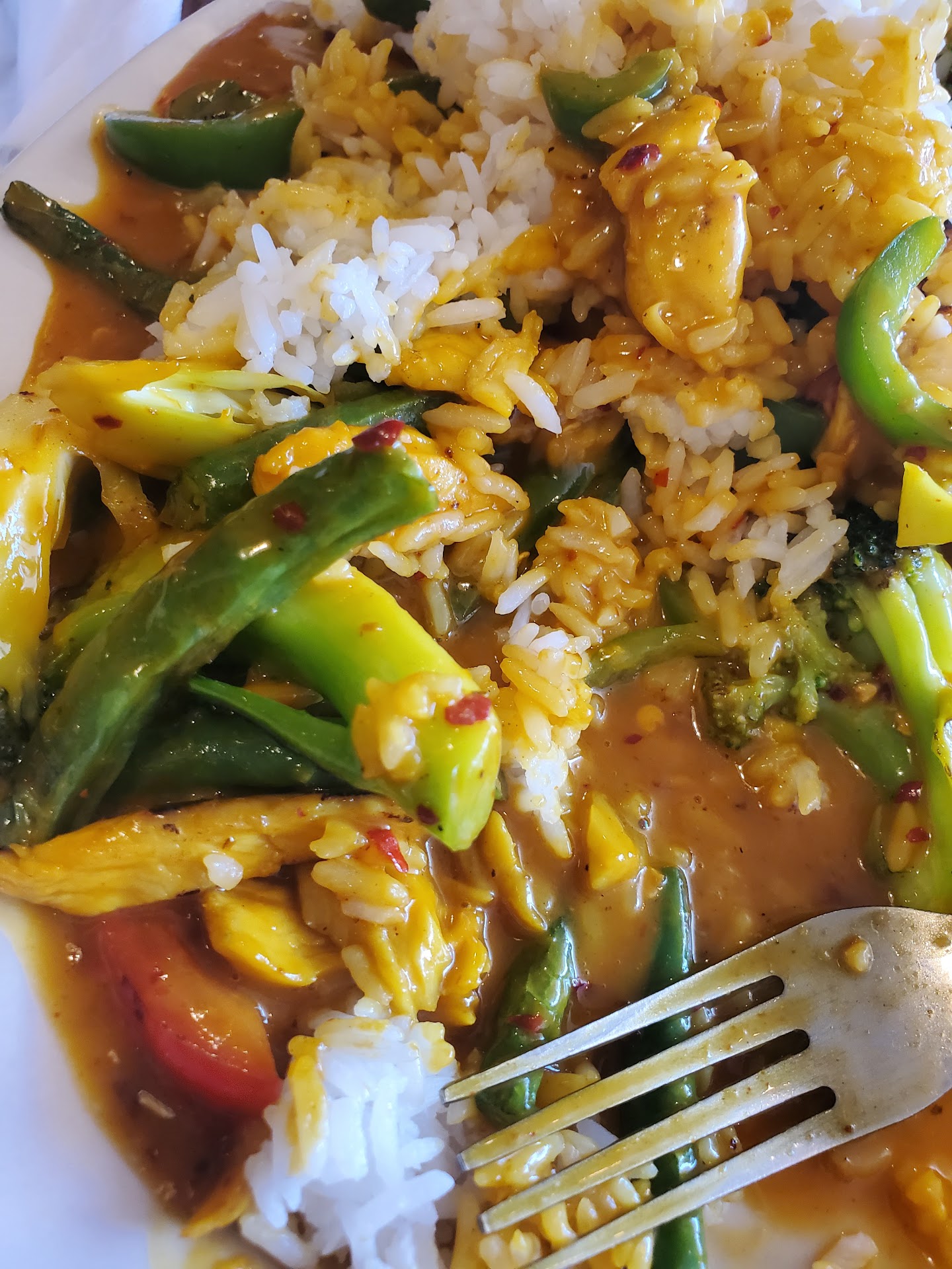 The Tom Yum soup here is as good as I've had anywhere. Loaded with mushrooms, it smells and tastes great. Springrolls are flaky and delicious as is the coconut curry vegetables and the spicy eggplant which I've had here. Others in my lunch party had the staples Pad Thai and Pad Pak and reported delight. The lunch portion is large enough that you'll get at least two meals from it and the food is almost as good re-heated as it was when it was fresh. Unfortunately, the strip mall location isn't exactly a beautiful garden, and the tables and chairs are clearly not fancy. Neither are all the hand-written signs warning about debit card charges and the like. But the plates and silverware are good quality, the wall-hangings are attractive in the typical and expected Thai fashion, and the service is friendly and fast.