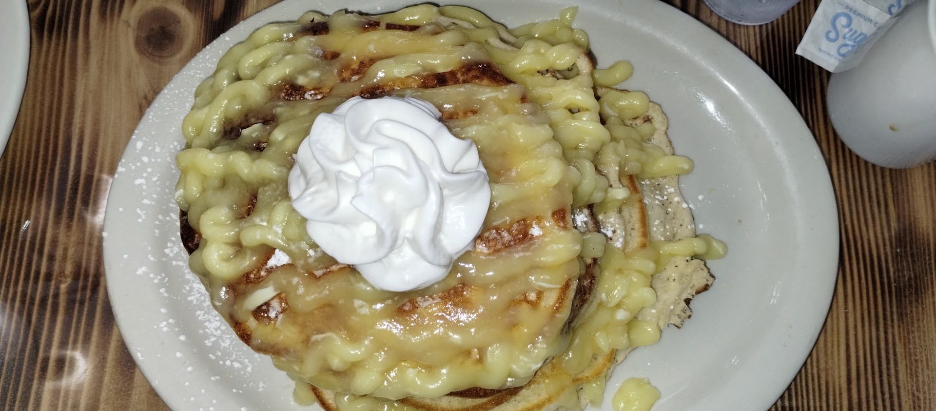 The strawberry stuffed French toast was unbelievably good. Lucious fresh fruit, cream cheese, thick fresh bread and what appears to be homemade whipped cream. it was dusted with a little bit of powdered sugar but it wasn't too sugary sweet. Loved it. Should have ordered a half order.