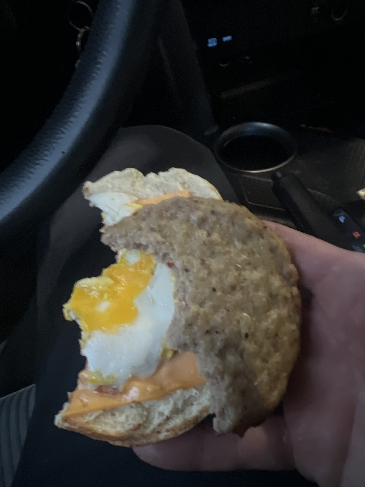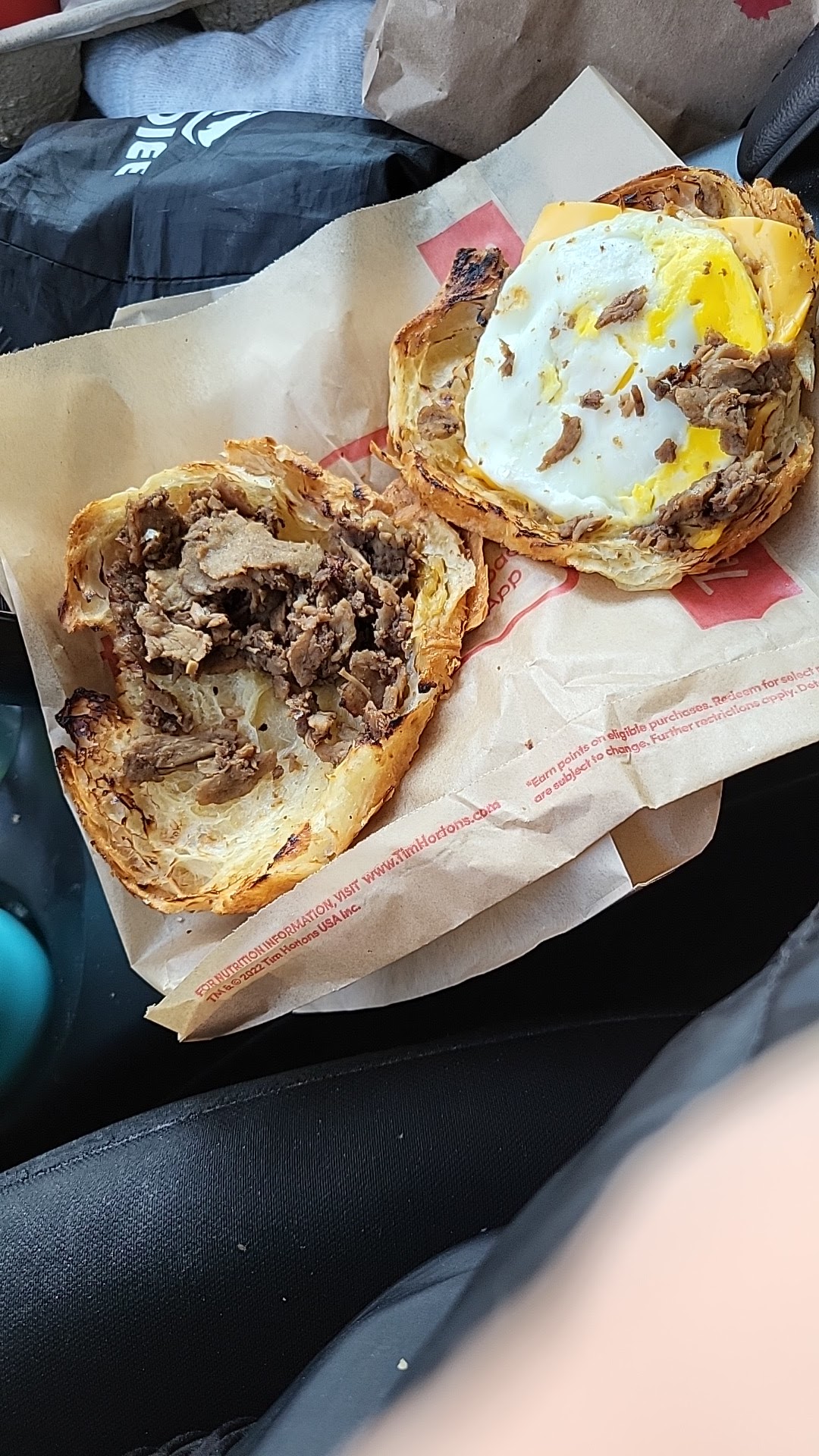 So I've been told by many people not to get any of their breakfast items on the list as far as hot sandwiches go because they don't get their own food their food is delivered and so it's been previously frozen. So today I decided to check it out for myself. I ordered the steak egg and cheese croissant. Should not have done that... There's literally about two tablespoons of ripped up steakums that you would give from the store on this croissant sandwich and it's basically in a singular pile it's not even spreaded out to cover the whole inside of the croissant. The egg is literally half the size of a round egg that you would get at McDonald's, the only thing that looks good about this is the cheese and you can even tell the cheese is fake. Usually I only come in and gets him Horton's French vanilla cappuccino a coffee for mother-in-law and some timbits and possibly an apple fritter. I'm not getting any more sandwiches because number one they're not high they microwave every damn thing. So don't do that, you'll be disappointed. As far as their donuts coffee and cappuccinos go I give that a 10 but today..... Not even close.
