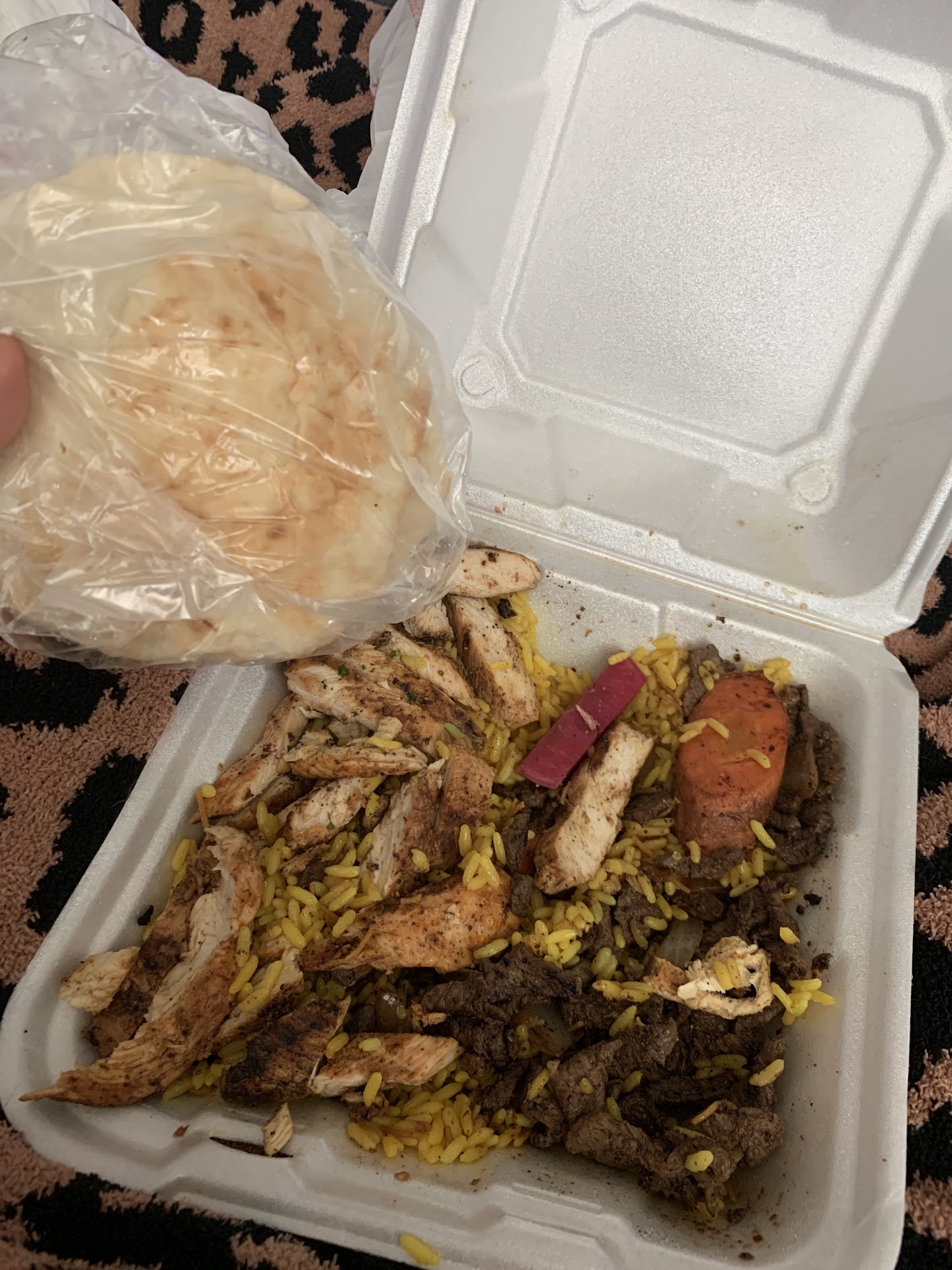 "THIS THE WORST CARRYOUT MEAL I'VE EVER PURCHASED" !!!! I gave them 35$$$ and they gave me 5 pounds of rice and 1/4 Pound of "TOUGH, DRY, OVERCOOKED BEEF AND CHICKEN; AND--- 7 pieces of bread THAT ONLY HAD 2 "EDIBLE LOAVES "!!! 5 LOAVES WERE BIG, ROUND CRUMBLY, SALTINES" (no exaduration).