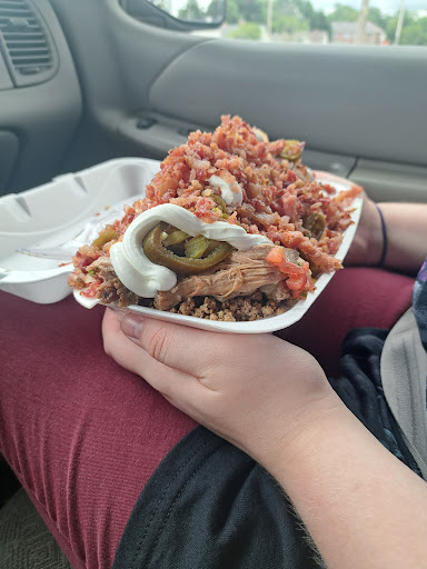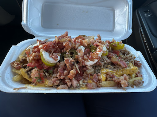 Read moreAt first, I was a little sketched out, y'know, food truck weirdly placed by a gas station has those vibes. Once we met with the man, the myth, the legend himself, the show began to start. We were two broke college students who ordered a loaded fry. He asked us, "Just the loaded fry?" and we both had a moment of, oh no, this is just going to be an overpriced side order amount of fries. We were extremely wrong. Once the legendary man himself started cooking, he asked us if we wanted the box to be able to close or not. Of course, we shook our heads starving as we were given plastic forks. Once the fries were done, we were left in awe as more and more things were piled up, jalapenos, brisket. He showed us that it was almost done as he piled sour cream on top, and just when I finally thought it was done, he topped off the mountain with mouth-watering bacon. I could only start in awe and joy as he handed it over to my partner. I had to hold the car door open and drive the utmost careful as to not spill such greatness. No words can even begin to describe how perfect this food is. I nearly teared up at the first bite upon getting home. If I had ordered this anywhere else, it would be 30 dollars worth of food, yet we got all of this for only 15!! All I know is this is the perfect food to grab before getting high. I WILL be returning to the man, the myth, the legend himself, one man...
