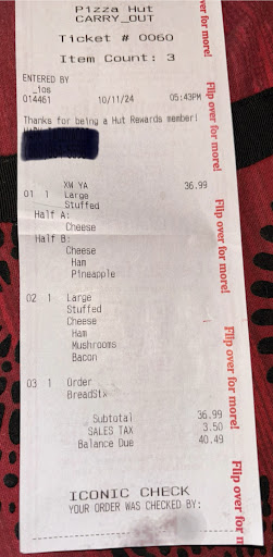 Ā Ā Ā Read moreI ordered carry out through the mobile app. It was a stuffed crust pizza, breadsticks, and two 2liters of Sierra Mist. Over $30.