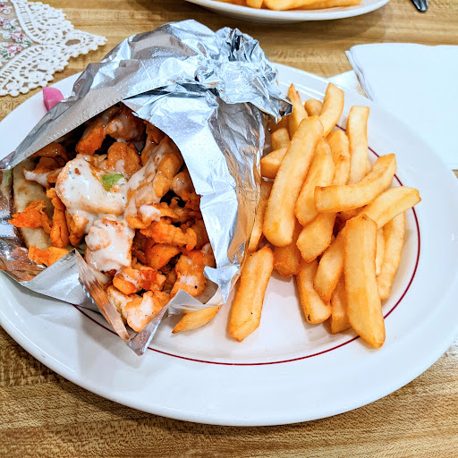 We went very classic: I had the chicken shawarma and my wife had the gyro. Both came with fries and some pickled veggie on the side. We dined in and orders came out quickly. Flatbread was pretty well filled with chicken, lettuce, tomato, and onion, plus some kind of sauce. Same for the gyro except it had 3 long, flat pieces of gyro meat. Fries were fresh, hot, and crisp. The garlic sauce on the side was quite good... Not something I'd usually go for, but I used it and my wife used all of hers plus what I had left.