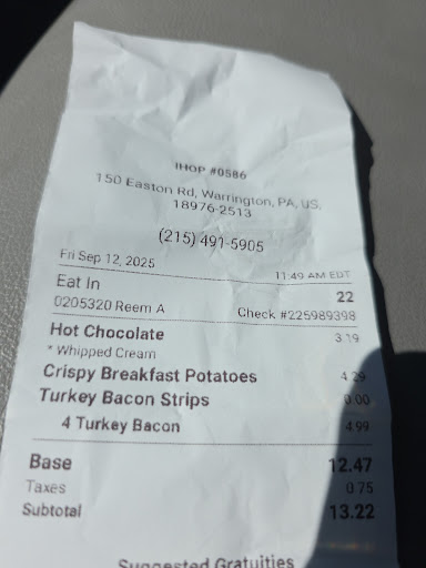 Read moreI brought my grandson to the Warrington IHOP for breakfast. He wanted a pancake with a smiley face (whipped cream and cherries) which comes with a side of 1 or 2 eggs and a meat. Since he would never eat the meat or the eggs, I stated to the server that I wanted substituted with a waffle. The order came out promptly - my breakfast and his decorated pancake and waffle. When I got the bill I saw that the was an $8.79 charge for the waffle!!! Who in god's name spends almost $9 for a waffle?? When I called the server over and questioned the bill, she informed me that they do not substitute for children's meals (and who would know that?) and that "I ordered the waffle"! I had to pay that kind of money for a waffle?? Tonight I felt the need to call a supervisor. I spoke to Liz ("supervisor") who said "Unfortunately (3 times) they had a price increase and that I was charged correctly for the waffle and that they do not do substitutes for children's meals. I can assure you that will be the LAST time I frequent this eatery! Buyer beware. I strongly suggest that you check the prices before you order or you will end up with a $30 bill for simple breakfast for a senior...