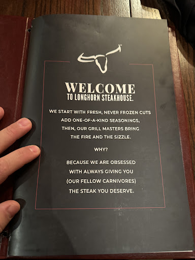 Read moreI recently had the pleasure of dining at Longhorn Steak House, and I can't express how incredibly satisfying and memorable the experience was from start to finish. If I could give more than five stars, I absolutely would! From the moment I walked in, I was greeted with warm and friendly smiles from the staff, setting the tone for the evening. The rustic and cozy ambiance of the restaurant instantly made me feel at home. The dimly lit, Western-themed dĂ©cor created an inviting and relaxed atmosphere that was perfect for a delightful evening out. Now, let's talk about the star of the show - the food! The menu at Longhorn Steak House boasts a fantastic selection of steaks and other delicious dishes. I opted for the Renegade Sirloin, cooked to a perfect medium-rare, and it was a flavor explosion in every bite. The steak was incredibly tender and juicy, showcasing the skill of their talented chefs. The seasoning was spot-on, enhancing the natural flavors of the meat without overpowering it. To complement the steak, I ordered the Wild West Shrimp as an appetizer, and it was a fantastic choice. The shrimp were crispy, succulent, and the spicy cream sauce had just the right amount of kick to awaken my taste buds. The sides were equally impressive. The Loaded Potato Soup was rich and creamy, while the Crispy Brussels Sprouts were a delightful surprise, offering a unique twist on a classic side dish. And let's not forget about the warm, freshly baked bread served with honey butter â it was divine! The service was impeccable. Our server was attentive, knowledgeable, and passionate about the menu, making excellent recommendations. My glass was never empty, and our dishes arrived promptly. To top it all off, I indulged in the Chocolate Stampede dessert. It was the perfect sweet ending to an outstanding meal. The combination of chocolate and pecans left me in dessert heaven. Longhorn Steak House exceeded my expectations in every aspect. Whether you're celebrating a special occasion or simply craving a top-notch steak, this restaurant is the place to be. The exceptional food, warm atmosphere, and impeccable service make it a must-visit. I can't wait to return to Longhorn Steak House for another unforgettable dining experience!