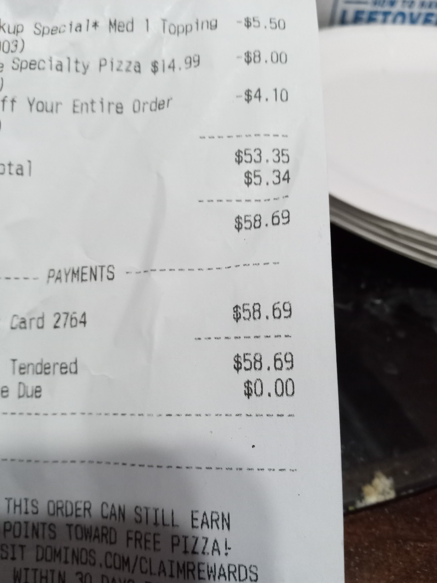 Read moreI have made approx 10 carryout orders over the past 3 months. So far, every order has been exactly as ordered and ready on time. Way to go Dominos in Warrior, AL. I have used the free app and it is pretty easy to use. First couple of orders made using the app took very little effort, but was not difficult by any means. I made what they refer to as an "Easy Order" and simply open the app, login, select Easy Order, turn checkout with the store and time I want it ready and BOOM, my favorite pizzas are ready for me to carry home and enjoy. Most of the employees are friendly and seem to enjoy working there and making sure I have a good experience with fast and friendly service. One delivery guy with his arms loaded down was kind enough to hold the door for me and my arms were completely empty. This is the type of service that will continue bringing me back on my houses Friday Pizza Day that I enjoy and look forward to every week. Again THANK YOU DOMINOS in...