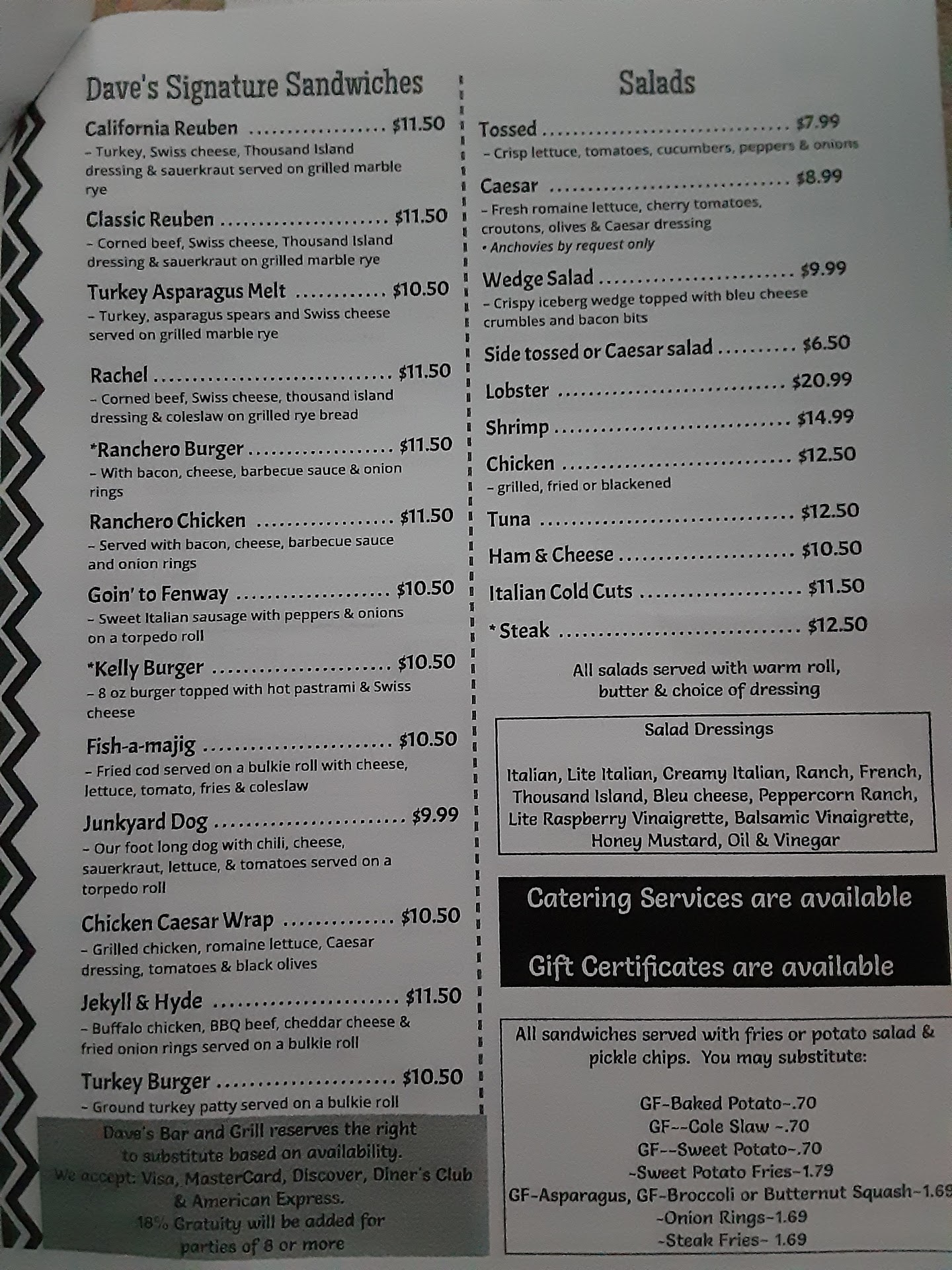 So we were done performing we had and me and my friends go to Dave’s bar just to hang out and eat. They didn’t make my Food right but I did not decide to complain Because there were so much of us in the group, and there’s no point in arguing over that. So after we eat, we tipped the waiter and we go to play pool because they have little games that you can play for a dollar. We’re playing pool and by accident one of the balls goes off of the pool table because we’re not experienced at the game and my friend was sitting on the pool table after that Some older gentleman with no hair, told us not to let any balls you know go off of the table which we Already knew, and he did tell my friend to get off. We apologize for that. After that we’re just talking and we’re like getting more change and The machine took two dollars from the $10 bill we put into the change machine. After that we decided to play pool on two tables and we put in the dollars and then he comes up running and tells us to get out because the bar is closed and yelled at us after he grabbed the ball aggressively and put them back into wherever they needed to be in that pool table, he didn’t explain any reason why he said that the lights were on and the bar is closing yet when we searched up on the Internet, the bar was closing at 12 and it’s still not even 12 and I’m writing this review. On top of that, he says that because the lights were on The bar was But he turned on the light after saying the bar was closed, which made no sense. Then there were still customers sitting down and he grabbed the remote and started turning off all of the TVs instead of giving anyone a 10 minute or five minute warning that the bar was closing, which would’ve been highly appreciated.after that, we leave a couple still in the barn they haven’t gotten kicked out. The waiters and waitress were very kind but that guy was not. I thought that at least that guy was having a bad day and probably he’s the owner because he’s not scared to be rude to customers but as I’m looking at these reviews, some of these reviews are complaining about a similar man, so I just think he has a bad...