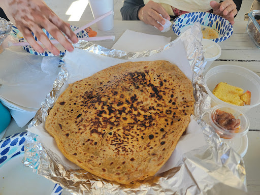 Thought we would try this place as I’ve gone to the other Indian restaurant across the highway several times and liked it, but wanted to try something different. This place was a little food truck on the side of the gas station so seating was at a picnic table in the shade, looking out on the diesel trucks fueling up, which was kinda interesting in itself. We loved the chapati, which was our first time having which is like a thick,fresh homemade tortilla, I tried a filled tortilla like bread called paratha for the first time with potatoes. It was really good and a little spicier than I expected but I liked it. Aloo gobi was delicious and freshly made. The mango lassi’s were a little thinner and less sweet than we are used to, but three of four of us like them a lot. Samosas were crunchy and flavorful and fresh. My kids and husband like them. They came with a tamarind type dipping sauce. We also ordered some chai. We would totally go back and maybe order less food as a little bit...