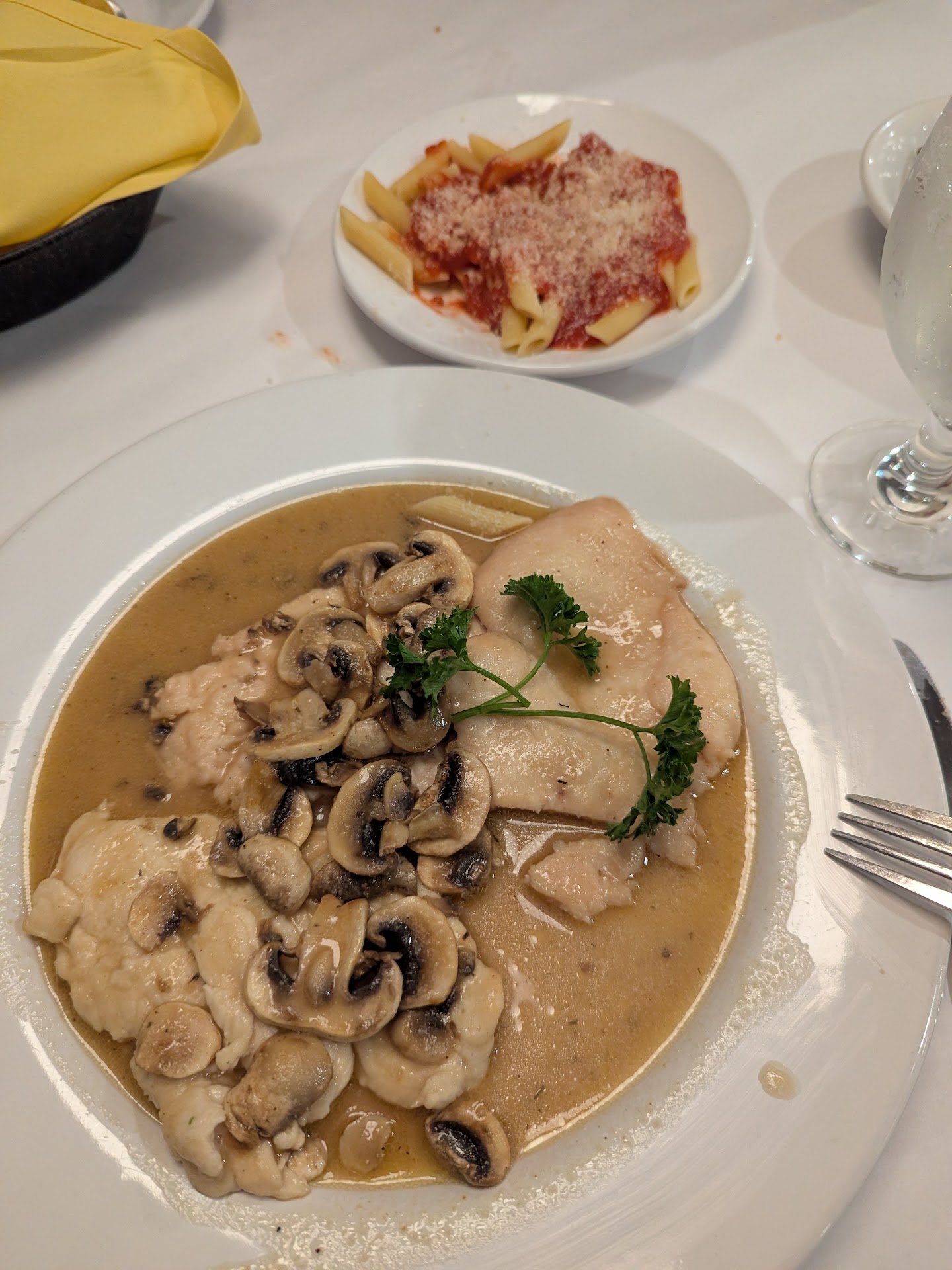 Brought my wife here to celebrate her birthday. We were seated promptly but waited and waited for a server to come to our table. Then we waited and waited for the wine we ordered and some bread. Our salads were delicious once they finally arrived, but oddly we noticed that our menus were still sitting on our table as we were eating our salads. Again, we waited and waited for our entrees to be served. The entrees we ordered were large and quite deliciousâvery satisfying. As we then sat there hoping to see a dessert menu, we could not help but notice that customers who had arrived after us were already leaving. Our desserts were large and absolutely scrumptious. We washed them down with the last few remaining drops of our water, as no one had ever bothered to refill our water glasses during the two hours we sat at our table.