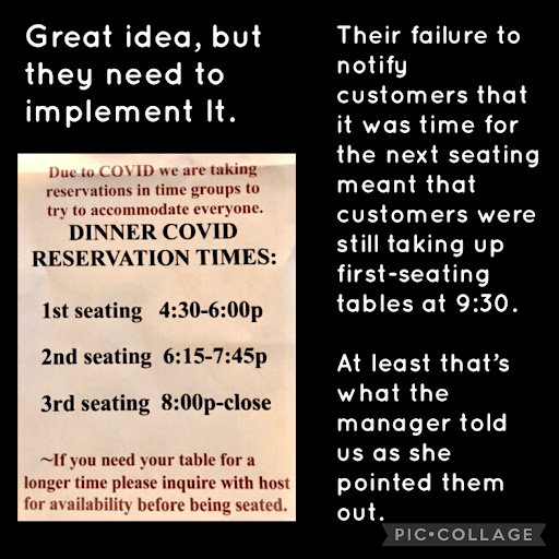 Honestly? That's when we were done. It wasn't the fact that our reservation wasn't honored. Or that the drinks weren't right. Or that the food was burned, cold, unseasoned, or that we were expected to pay full price for our meals despite all of our problems.