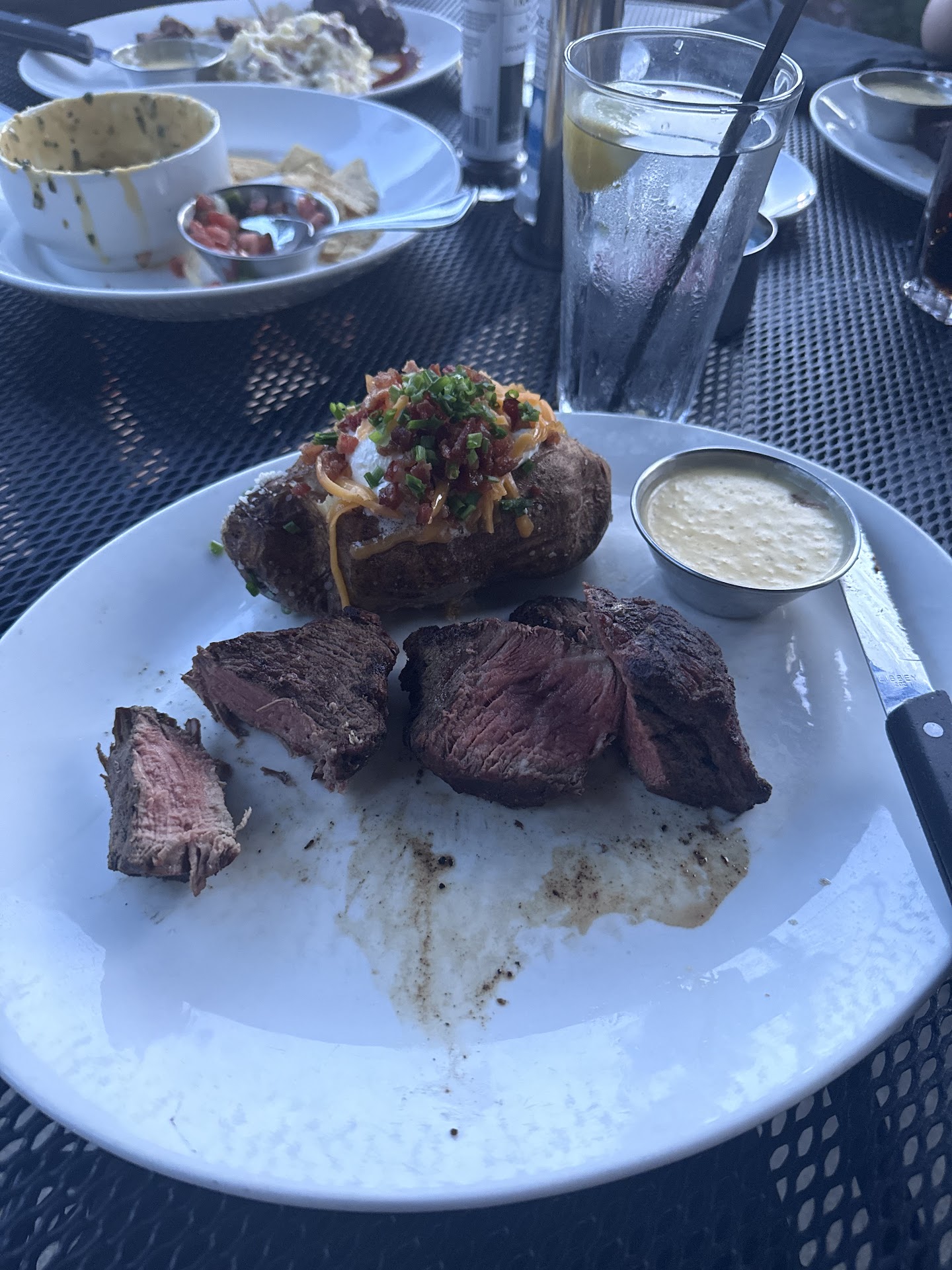 The appetizer was the Mexico city spinach con queso dip and chips. It was great. It came with a fresh tomato salsa that we mixed in the dip. It was so good! The ceasar salad was not drenched in dressing. For our main courses, we ordered the fillet mignon with béarnaise and a grilled pork tenderloin with Thai bang bang sauce. I got the steak cooked medium, it was probably cooked closer to medium rare, but this was not an issue for me as I eat steak anywhere from seared raw to medium, flavor wise it was delicious as was my wife's pork tenderloin. The bang bang sauce was sweet and spicy without being overwhelming in either direction. We also tried the NYO (not your ordinary) Mac and cheese. It was creamy and delicious, a little too rich, though, and needs another flavor profile to perfect it, in my opinion. Still, it was so good. Lastly, we had the house made key lime pie for dessert, and the Waitress suggested coffee. The pie was a perfect balance of sweet and creamy with lime that was not overwhelming. The coffee was decent, French press coffee, a little acidic, so we added a little cream and sugar. While everything may not have been perfect, most things were, and they earned a well-deserved five stars from my wife and I. No place I have eaten has touched their level of kindness and service.