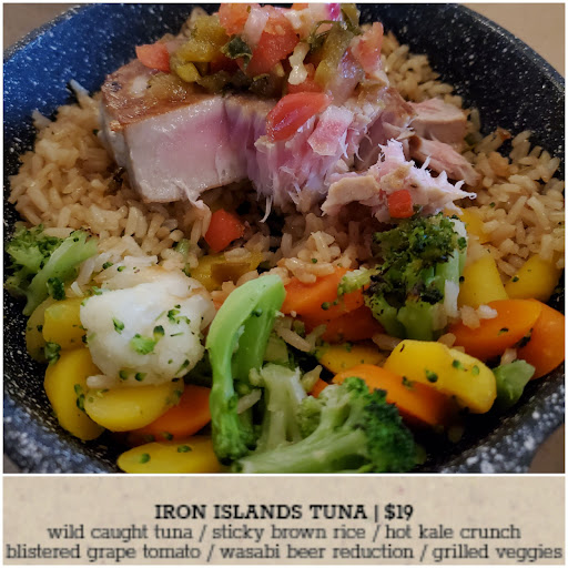 However, the Tuna was meh and totally misrepresented on the menu. The brown rice wasn't sticky rice as advertised, and reminded me of a military chow hall. There was no hot kale crunch served with my meal as advertised. There were no blistered tomatoes as advertised, There was no wasabi beer reduction as advertised. The grilled veggies, while they seemed fresh, were not grilled but rather microwaved with no semblance of any seasoning. My mid-rare tuna was overcooked (I usually do rare, but their suggestion of medium scared me), and it had some citrus salsa on it that wasn't advertised.