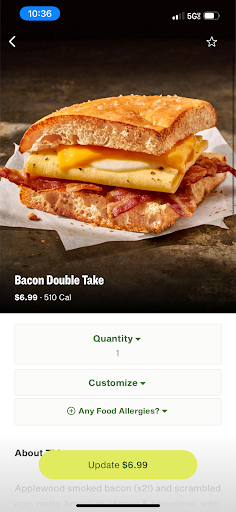 Read moreService is always slow at this location. The employees aren’t usually very friendly, especially management. Not the cleanest. They don’t keep any silverware out and get annoyed when you ask for it. This last time they put all the food we ordered on one plate, nothing to eat it with, then got snippy when we asked for silverware and plates to split the three entrees between 3 people. If you ask them for something and you’re luckily enough to not get attitude back, they don’t even make eye contact and just put stuff up on the counter and walk away. There’s no instruction that things are made and picked up at different counters. But god forbid you ask them where it is. It just really shouldn’t be this chaotic and disorganized here. This is the only location we have real issues with. Nothing over the top, but definitely noticeable and enough to feel completely unwelcome. You know it’s bad when you hear other customers complaining or talking amongst themselves about their food and the service every time you’re here. We also only got 2 small pieces of bacon on the Bacon Double Take, which is literally supposed to have double the bacon, according to the description. Attached a photo of what we were supposed to get. Looks like a lot more than 2 cold...