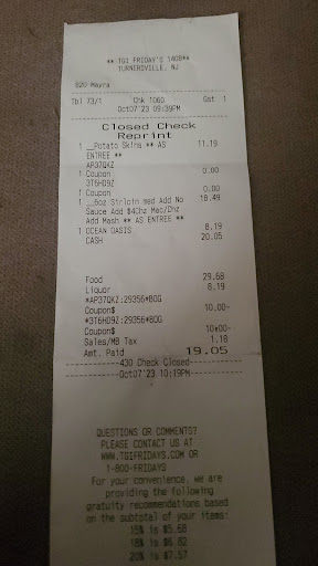 Let me start with the fact that I donāt write many reviews. But when I do itās because something went exceptionally well or terribly wrong., and I feel situations like these should be known by the public. We ordered takeout from this TJIF location because itās just a mile away from where we live. This should have never happened since we had several times already bad experiences with this Thompson Street Capital Partners (TSCP) owned chain. The first time, a few years ago in La Jolla, CA, it was really terrible. But these 3 recent times it was bad locally, here in Washington Township. I have nothing to complain about the service, since we have ordered takeout. But both the food and the value have been TERRIBLE. We came a little too early, so we picked up the food as soon as itās been ready. As I have mentioned, it took me under 5 minutes to get home, we immediately unpacked, yet EVERYTHING was already cold. It appeared like most if not all of the meals have been pre-cooked and mildly reheated at best. Nothing tasted fresh, from the softened fries to the shriveled salads. I used ātasteā quite liberally, because ALL the food was bland, totally tasteless. Weāve ordered the Classic FRIDAYS Combo. All 3 items were incredibly savor less, but the worst have been the potstickers. Cold, rigid, dry, and absolutely tasteless. I realize that the āTraditional Wingsāā is only an appetizer, but at $11.35 one would not expect a ridiculously minuscule, cold portion. The Chicken Al Pastor Bowl in pictures has a few tortilla chips on top but in reality there are tons of chips and a few tiny pieces of TASTELESS, cold chicken breast. The FRIDAYS āSignature Whiskey-Glazeā burgerās patty was cold, dry, thin, and bland. The Candied Pecan Chicken Bowl was again a ridiculously small portion with salad that tasted old. The separate order of seasoned fries came also cold, the fries were soft, and appeared reheated. I donāt have unreasonable expectations from a TJIF restaurant, but at a $74.24 bill (no drinks whatsoever and taxes not included!) I would like to be able to get a decent dinner for 4. I seriously donāt want to hear the old and tired pandemic excuses, nor the inflation stories, and neither the ālack of qualified personnelā story, because I KNOW THE TRUTH: at corporate level all these are perfect excuses to lower the quality of ingredients, minimize the portions, and maximize profits. While the above excuses at one time might have been somewhat justified, now are only a blessing to capitalize upon. Altogether, our bad experience has probably less to do with this specific Washington Township TGI Fridays location as much as it does with the Thompson Street Capital Partners corporate policy. I repeat, I have nothing against capitalism or profitability, but I am totally against practices employed fraudulently to profit after extreme situations. So, people, stay away from TJI Fridays or expect to be...