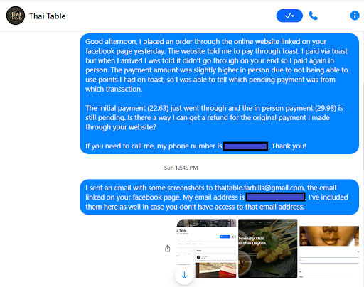 It was my understanding that the initial online charge wouldn’t go through because Thai Table hadn’t received/approved it and I had paid for my order in person, but the next morning the online charge was on my bank statement. I contacted Thai Table immediately (via Facebook message, email, and voicemail). It should be noted that in addition to their active Facebook page, both their answering machine and their carryout bags also direct people to order from the website that they say they are receiving neither money nor orders from. I received a reply to my Facebook message that afternoon (attached) saying that they would get in touch with Toast.