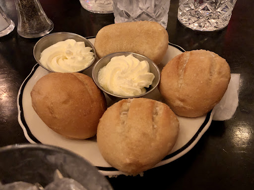 We shared the oysters on the half shell appetizer (6) which we ordered after Abe got us interested by mentioning oysters in one of the specials. For dinner I had the Caesar salad, 8oz medium rare filet, and creamed spinach. Husband had the Tavern salad, Ribeye, and mashed potatoes. My filet was cooked perfectly, and it and the creamed spinach were easily the highlights of my meal. The sides in a little crock which kept them piping hot and made for easy sharing. The filet paired with their steak seasoning is DIVINE. Jars of it are available for purchase but Abe gave me one on the house for my birthday because I liked it so much! Everything in our meal was an appropriate portion - we were full but not overstuffed.