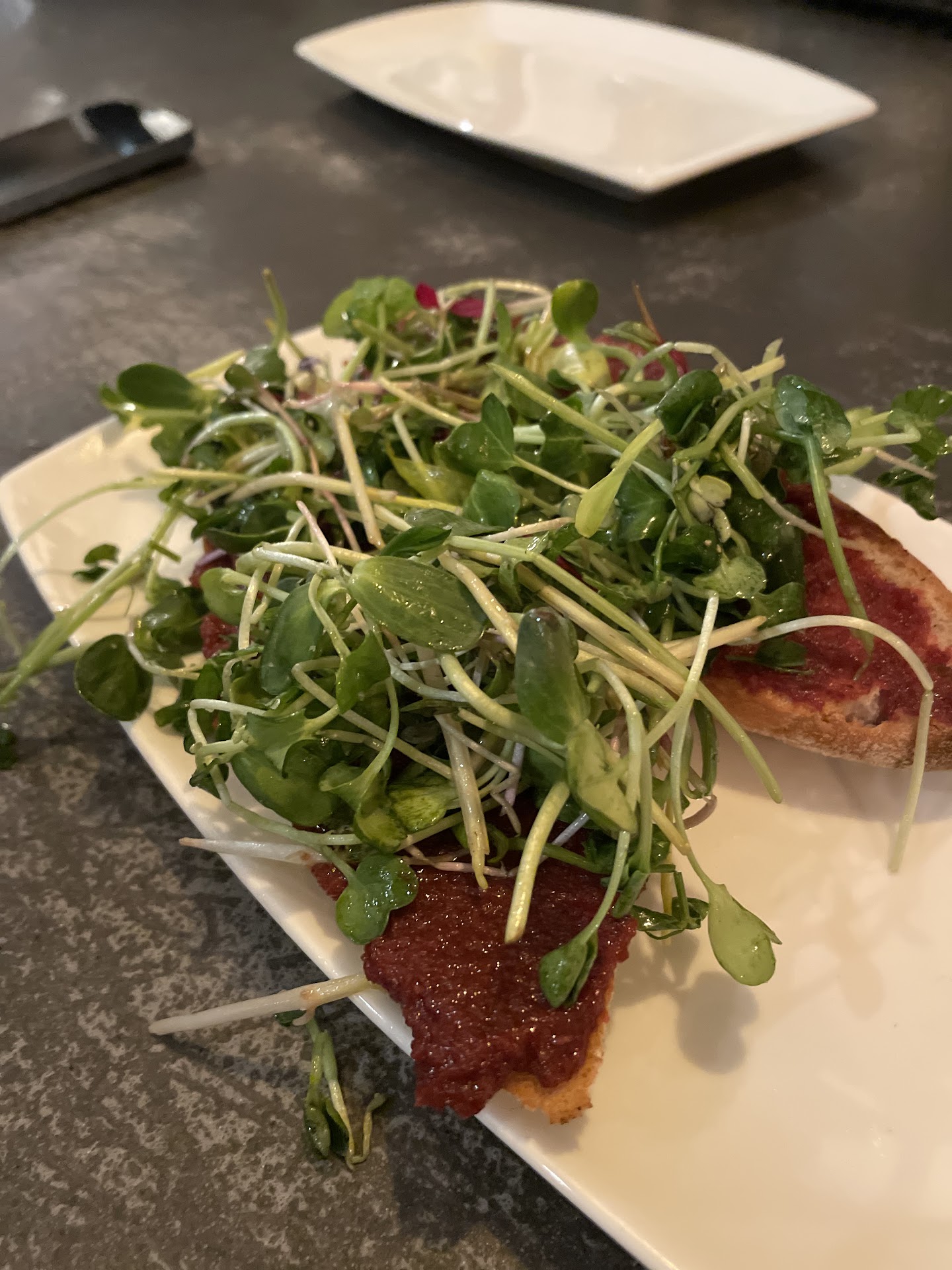 We each got a flight, and we shared the pours between the two of us. Even the flight pours were large enough to share between two people. The bubbles and the reds were all good, the zinfandel they had was a standout. We shared the smoky eggplant crostini was very good. We also got entrees of blackened salmon with the brussel sprouts and a sausage pizza.