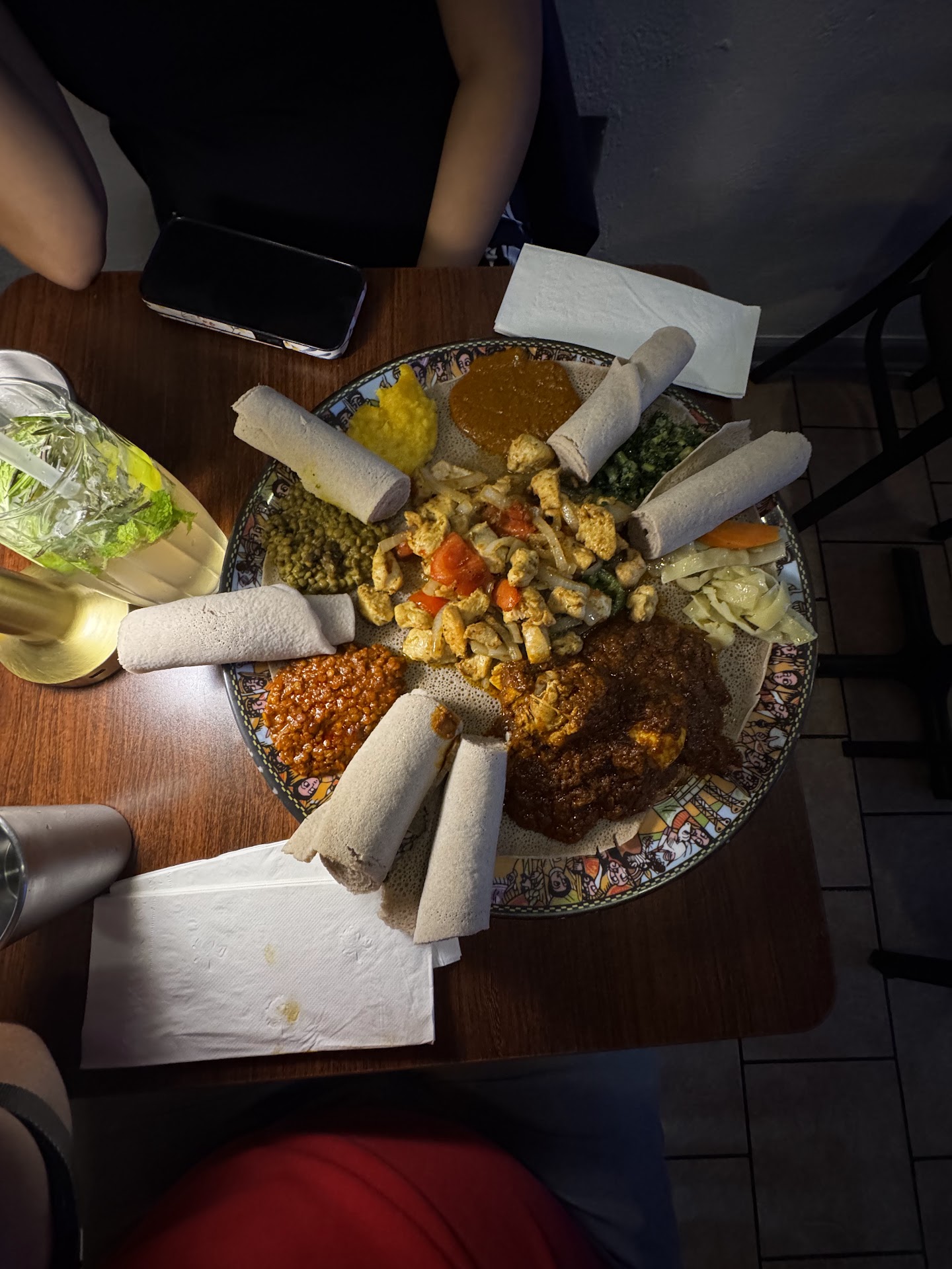 I stopped by to grab a bite to go being in the mood for ethiopian food and seeing a variety picture that made me know exactly what I wanted. When I walked in, the woman who greeted me was SO welcoming and after showing her the picture and placing my order, she invited me to have a seat. I ended up grabbing a mocktail at the bar which was SUPERB. It took him a few moments to make but that's because he took his time crafting it like a signature drink and you could taste the love that was poured into it no pun intended. You could taste the mint, the sweet, and not to mention the atmosphere was nice. Not too busy and though they were closing in an hr, that didn't stop them from providing a1 customer service to myself and those who came in after me (all too used to people who dread those last minjte customers but they were so kind and happy to provide their food and service). When I got home, the food was fantastic! They separated the meats in one container and the veggies in the other. All in all, it was a 10 out of 10 for me. The dish was $65 for 3 meats variety and 5 variety of veggie servings, but worth every penny and enough food to eat from another 2 times at...