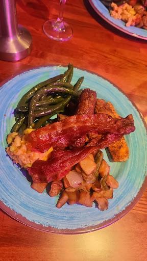 Our server came out with our food prepared, they basically give you an entire plate with a little bit of everything on their menu (bacon, sausage, potatoes, steak, salmon, macaroni and cheese, and green beans).