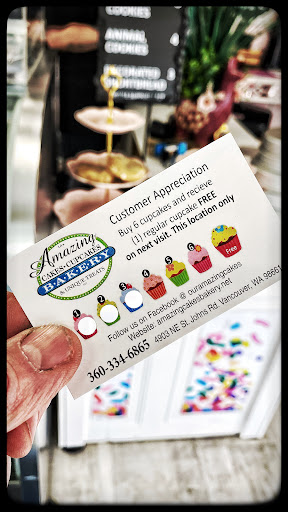Over the years, this tiny little cubbyhole has been through a lot of different metamorphoses. It's so small that you'd want to know your co-workers really well and Ideas for small pocket businesses have come and gone. Perhaps Amazing Cakes is that Amazing Idea. The interior is bright and clean and the shop keeper was friendly and fun. The woman I talked to obviously has deep roots in the community made me feel at home and welcomed. She made sure I got a cupcake card, so I could claim a free cupcake after six paid and I tucked it away right next to my favorite coffee card, plus I got an extra punch.