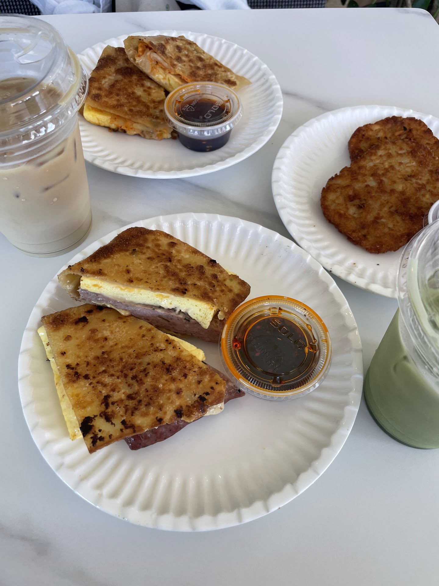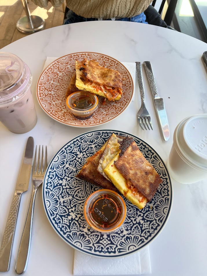 We both got their kimchi sandwich, which came with a generous slice of steamed egg, American cheese, kimchi, and a bona fide heap of chili crisp. Both the flavors and textures were in perfect harmony -- the fragrant scallion pancakes paired beautifully with the umami and slight spice of the kimchi and chili crisp. The pancakes were also super crispy and flaky, which was a great contrast against the soft steamed egg and melty cheese. Overall, it was a phenomenal twist on a classic breakfast sandwich! It did get pretty messy, as the scallion pancake was a bit greasy and didn't have the best structural integrity, so it's not a sandwich I'd recommend taking for the road. The side of chili crisp only adds to the mess, but it's such a game-changer -- the sandwich is good on its own, but the deep umami punch from the chili crisp takes it to the next level.