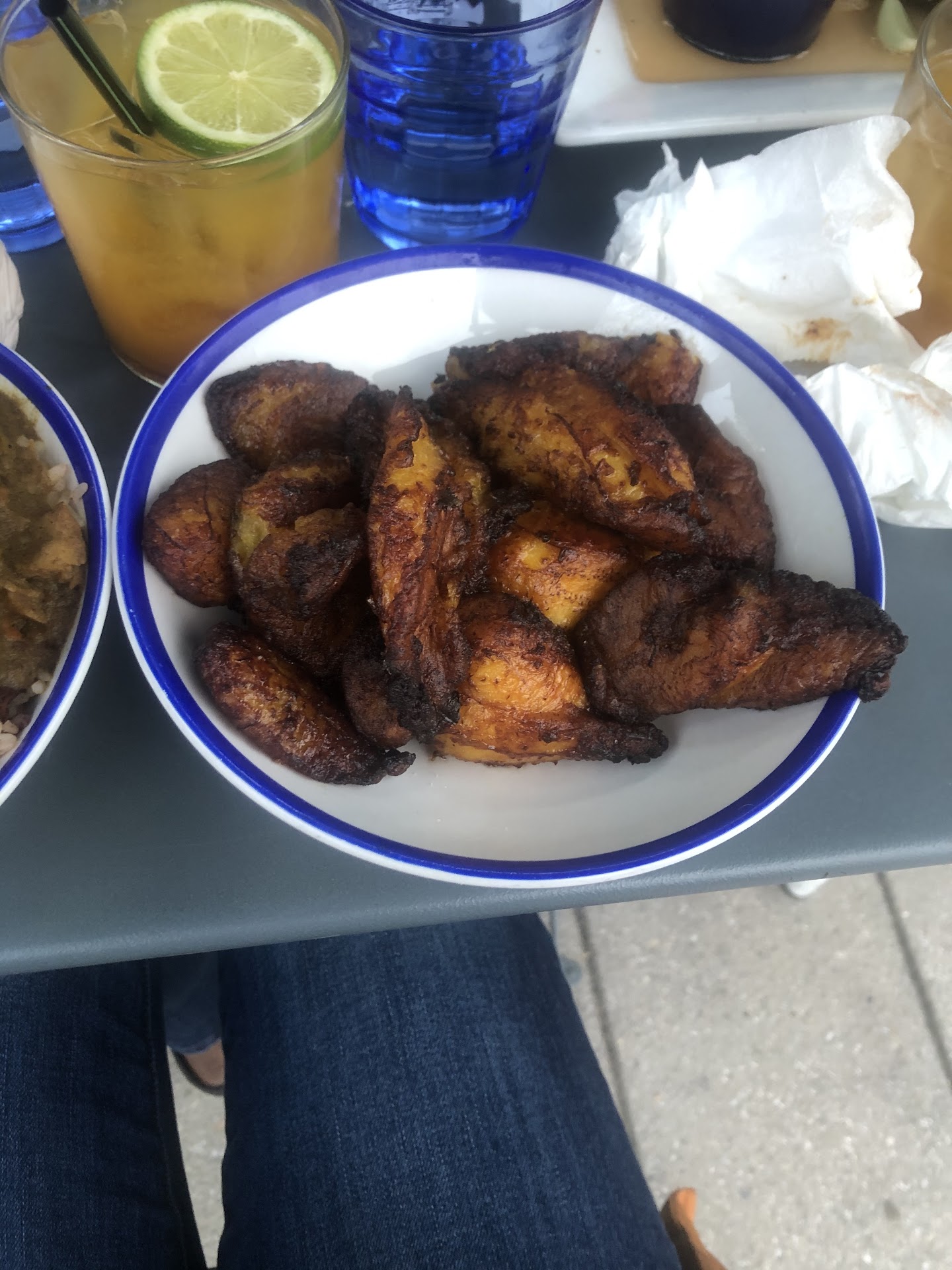 The waiter told us to scan the QR code to access the menu. The menu had various Jamaican/Caribbean-inspired dishes. We decided to order one of our favorites, escovitch fish. The waiter asked what size we wanted and gave three options: 2.5, 3, and another dimension. We decided to share the three-pound fish. You have to order the sides separately, so we ordered rice and peas and fried sweet plantains. It took a little while for our food to come out, but finally, it did. The fish was huge, and I knew we would be unable to eat it all and would have to take some home. I took a few pics, and then we dug in.