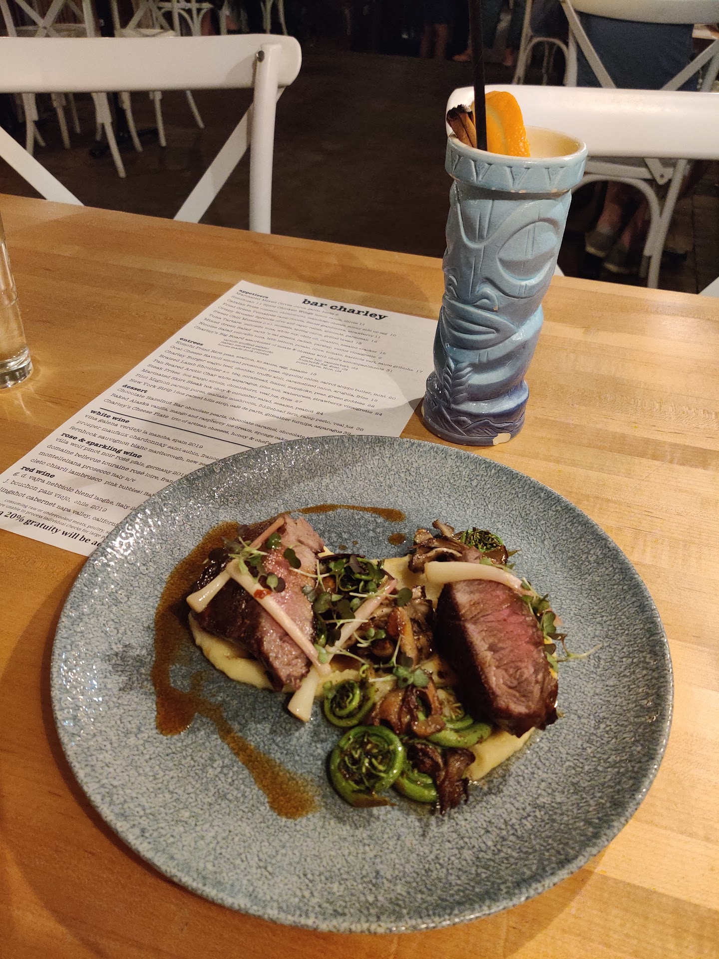 My server was Ashton and he walked me through the menu and was great in suggesting things accordingly. He brought to my attention that Bar Charley started as a steak house and their stake program is well versed and executed. So a filet was ordered. It had magnificent plating. It presents cut in half so there's no surprise once you dig it. It was cooked exactly as desired it was smooth to cut through. The parsnips puree, maitake mushrooms, ramps pesto, and fiddlehead ferns were not for garnish they were carefully involved components that enhance the cut of protein they were paired with. I want to cook this at home but why when they have it here đ.