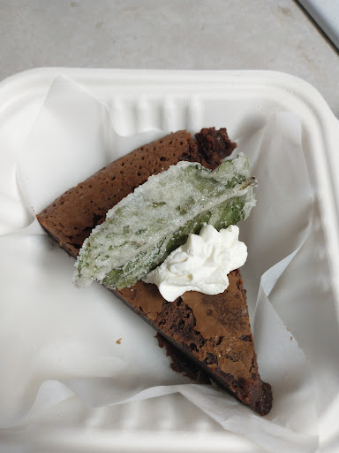 I then wanted the local Hillcrest farms Rhubarb & Strawberry's as a Crisp, but it was already sold out (good sign).. So I considered my other options and With Hesitation ordered the Flourless Mint Chocolate Torte w/whipped cream and a Candied Mint Leaf. For decades, every Flourless torte I have had was a disaster.