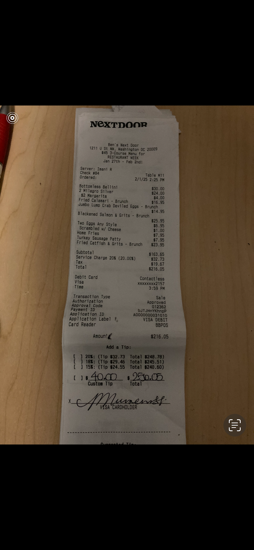 He eventually responded by sending me a picture of the recovered receipt which clearly showed a fraudulent signature added to the bottom of the bill along with the additional $40 tip. The signature was in a women's handwriting which leads me to belief that our waitress added the tip to the bill when we had to leave abruptly.