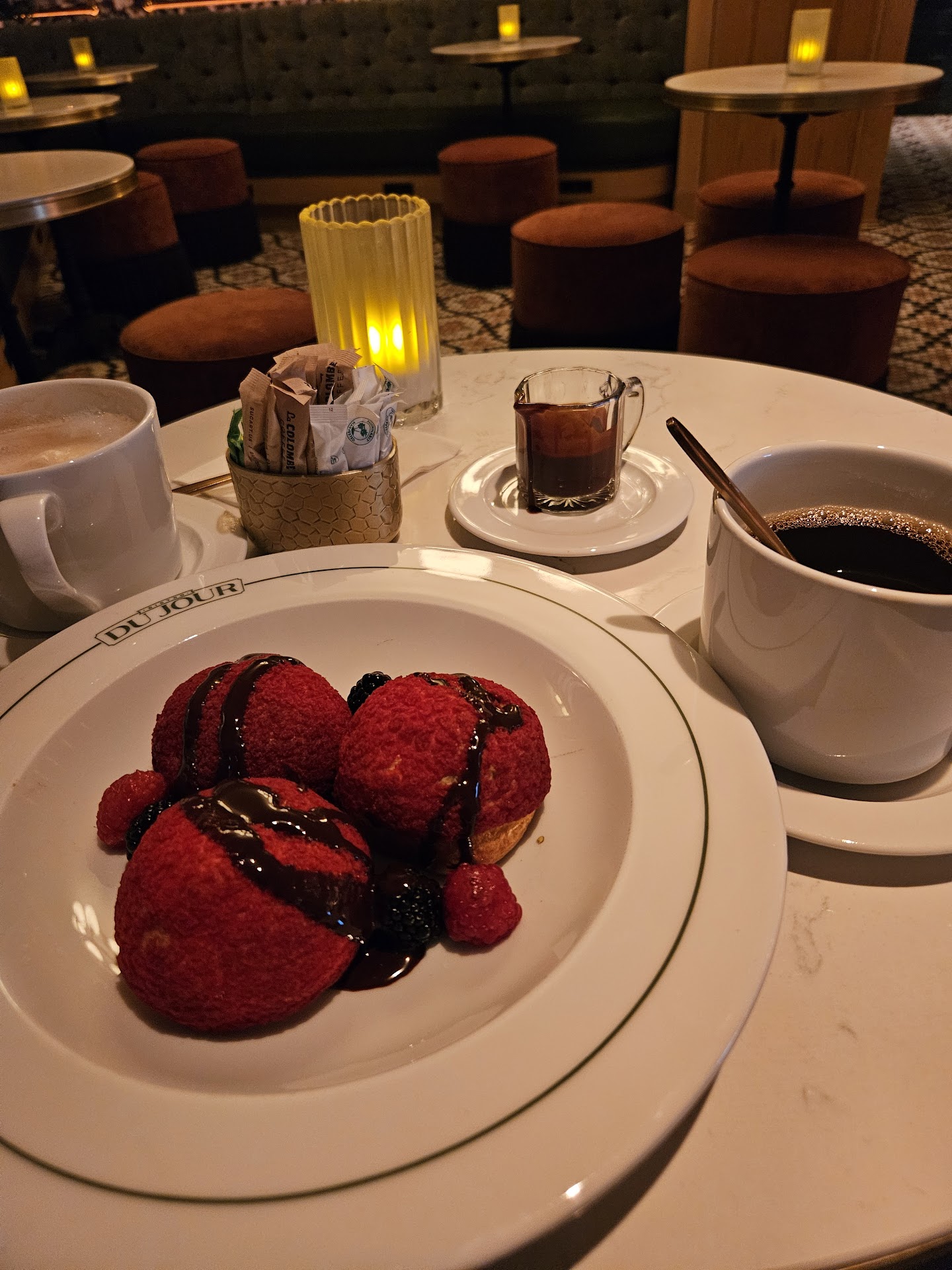 Our hostess was very friendly when we entered. She told us it was happy hour at the bar and the lounge areas. We had never been to this location, nor do we frequent bars, so she took us around the corner to see the lounge, so that we could choose between that and the dining room. We immediately chose the lounge! The atmosphere was cozy We sat down, got comfortable, and were prepared to have a nice evening. But then... JP (tall, beard, tattoos). I can honestly say he was the worst waiter I have ever had since moving to DC. We sat down, and as he walks over to give us our menus, he placed them on the table (which was wet with puddles of water), mumbles something about the happy hour, and walked off. I could feel the tension that was directed at us and I wasn't sure why considering we hadn't done anything to him. When he comes back and asks for our drink order, my husband orders a cappuccino, and I attempted to order a matcha latte with vanilla and oat milk. If it sounds like a pretentious drink, it's only because I was introduced to it at the Wharf location (a kind waiter there recommended it and I fell in love with it). JP didn't know what I was talking about. It seemed as though he had never heard of matcha, which is totally fine. Although he says he could ask, and goes on to yell Justin's name across the room, he says to me: "I'm a bartender not a barista" and slinks away with his continuing bad attitude. Our last interaction with him was when he proceeded to wipe our table free of water...or tried to? He does one pass over a small section and stinks away again (check your cameras if you don't believe me). Maybe he was having a bad day, or maybe he didn't like my husband's Cowboys hat, but whatever was going on with him, he need not take it out on me.