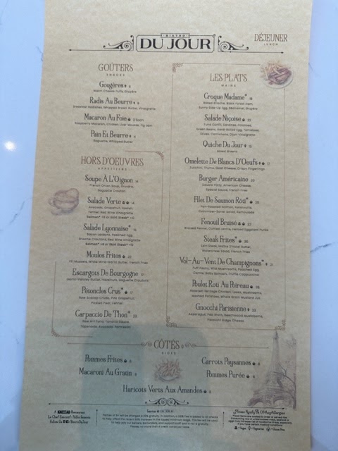 Read moreBased on good reviews, went here for brunch after picking up husband from Union Station, 1:00 pm Saturday. All told - extremely disappointing. We waited a loooooooong time just to place an order after the lovely hostess sat us. The waitress didn't show the slightest cognizance of French; not so much as Bonjour. He ordered French Onion Soup. Inoffensively bland, which shouldn't apply with this soup. I ordered quenelles (steamed cod dumpling, lobster sauce). FAR too salty. At first we ordered just that, for sharing, but the waitress said they were too small. They weren't. No bread. We had to ask. Choices were sourdough and what she said were four chopped baguettes, with garlic sauce. Seemed like a lot of bread but we just wanted baguette. It wasn't four baguettes, chopped. It was 4 SLICES of baguette, no sauce, covered inseparably in green garlic butter. NOT the plain bread we thought we'd get for dipping with soup and lobster sauce, and too strong a flavor for the intended use. Worse, by the time the bread finally arrived, the appetizers we'd requested it for were almost done, though we'd held back awaiting bread. He ordered steak frites, medium well. It was close to rare -- quite pink -- inside. I ordered Oeufs Sur Le Plat. Fine. I also ordered an Earl Gray tea. It never came. THAT characterized the entire service experience -- molasses slow, inattentive, largely indifferent to the point of coldness. This, in spite of the fact that at that time of the day few tables were occupied and many servers and host-appearing people buzzing about. Finally, even after we asked for the cheque, it took an age to get it. He said it before I did: not coming back. Subtotal $101. and change. A lot of money for a completely unimpressive meal and...