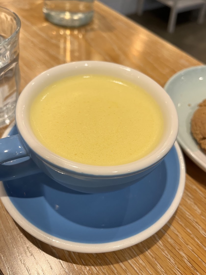 I visited Bluestone around 4 PM in the afternoon, so it was a bit too late for coffee, but I love that they offer a wide selection of non-coffee drinks. I got their golden latte, which includes turmeric, almond milk, and a few other spices; it feels warm (both literally and figuratively) and is a lovely caffeine-free drink that helps me feel healthy as the weather gets colder. And to counterbalance any potential health benefits I might have gotten from the golden latte, I also got their chocolate chip cookie, which was massive -- almost the size of the plate they served it on. It was a solid cookie, slightly chewy but with a nice crust, although it was a bit lacking in chocolate chips.