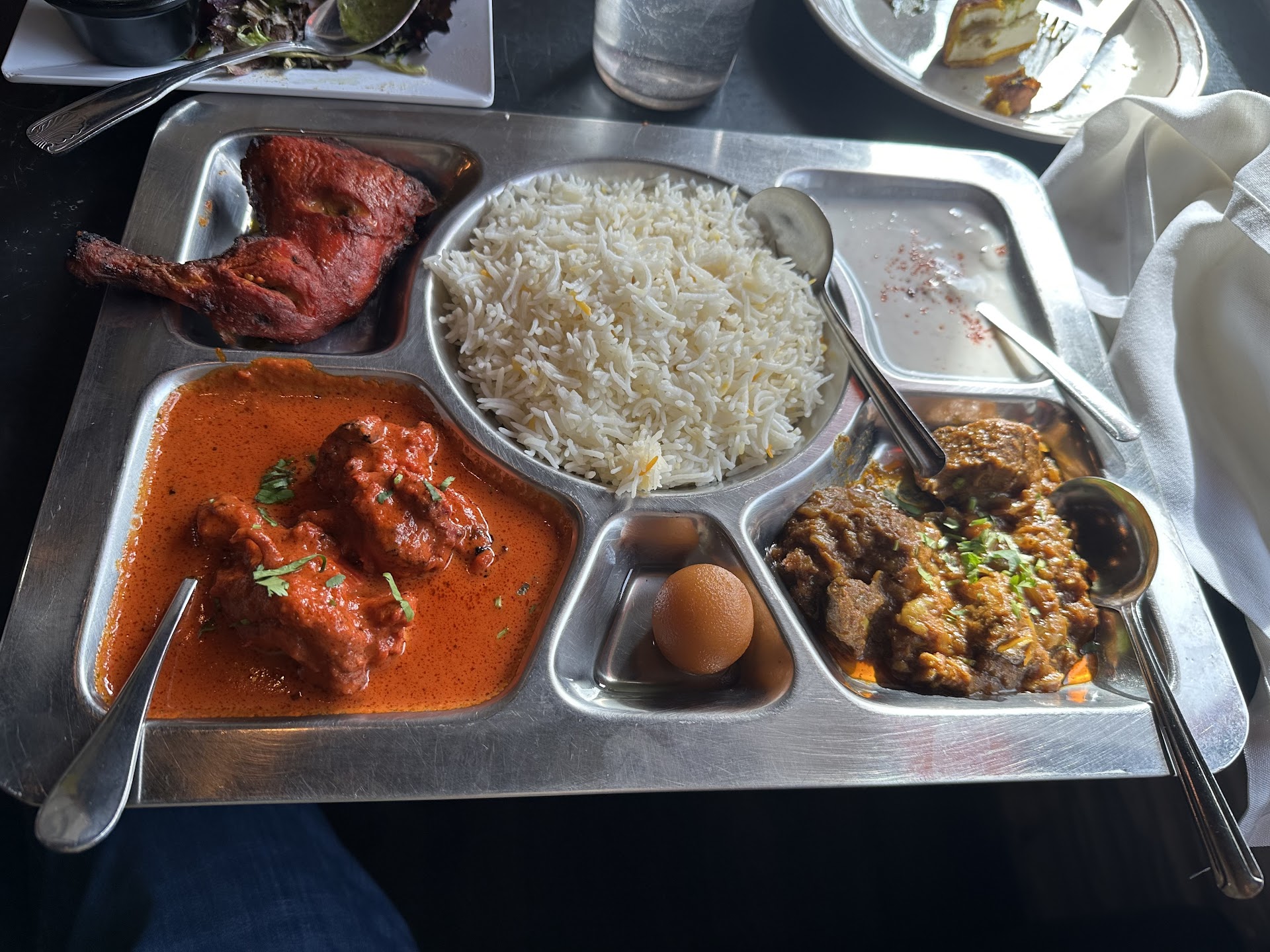 Food: I've eaten here three times-- twice in person and take out once. The first time, for takeout, I got the two different thalis (veg and non veg), which was a wonderful way to be introduced to several of their dishes.
