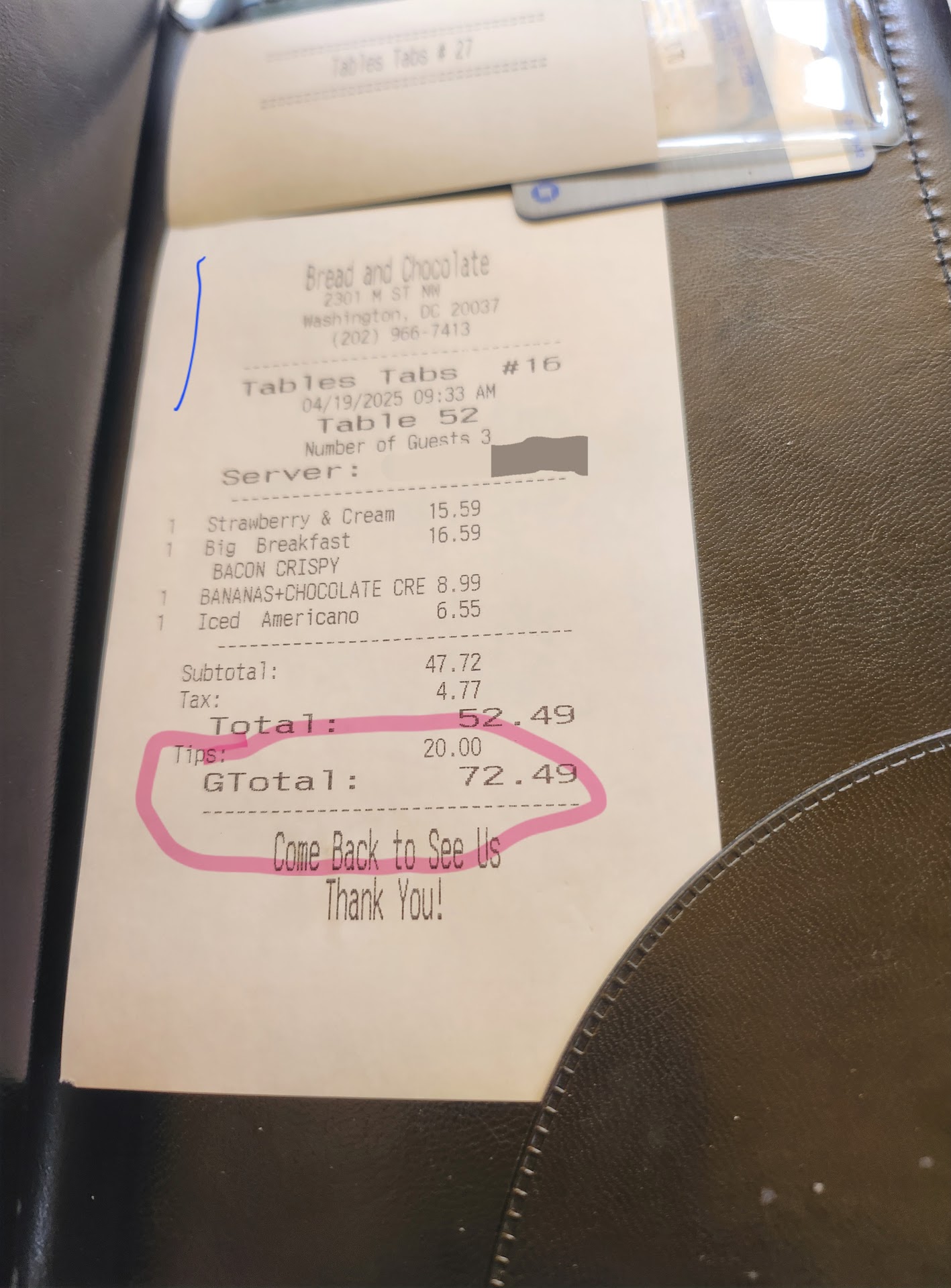 The waiter came back with the revised receipt (photo 2) with the 20% tip. I gave him the okay and he returned with the final receipt (photo 3) for me to sign.