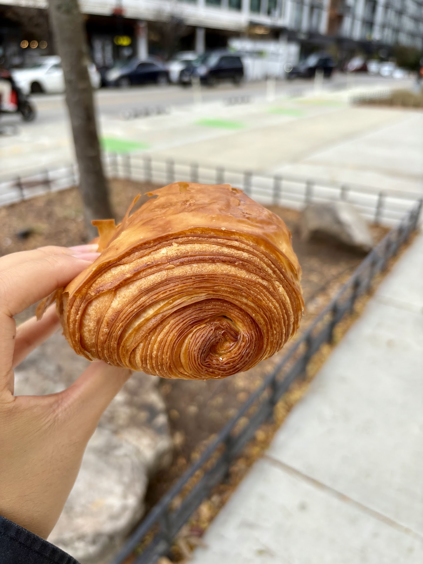 They don't have a full-time cashier, so if you get to Bread Alley during one of their off-peak hours, you have to knock or ring the bell and wait for one of their bakers to come open the door for you. Once they do, you'll be welcomed into a cozy little shopping area with just a cash register, small pastry case (which just includes a few exemplary pastries -- the rest are in the back), and a wall of various types of bread. I didn't end up grabbing one of their breads, but I'll definitely have to make my way back for them; the harissa black sesame sourdough looked incredibly enticing, but I just, unfortunately, didn't have a need for a full loaf of bread at the time. However, I was in the mood for a sweet treat and decided to get a classic pain au chocolat. They don't have an indoor seating space, given their relatively barebones front-end, so I just ate my croissant as I walked home. It was a beautiful croissant, with a gorgeous lamination inside and nice glossy finish. It was a smidge too doughy for my taste, as I generally prefer really light and airy croissants, but it was...