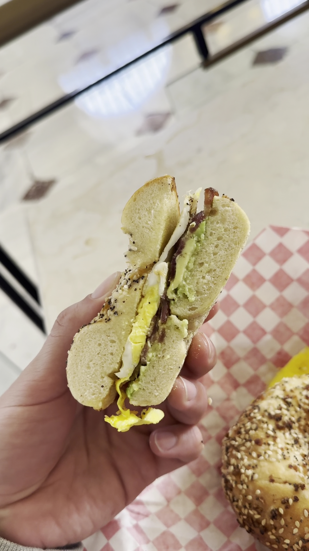 When I opened my bagel, I literally laughed out loud in disbelief. As I peeled back the red and white checkered wrapping, I saw maybe 1 piece of bacon, half an egg, and a thin layer of avocado spread over a small, unappetizing bagel. It looked like one of those bagels you can buy in bulk at a Walmart.