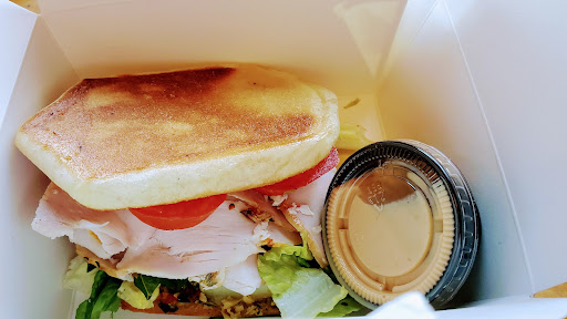 I ordered the Turkey Muffuletta Panini with Aioli and my hubby ordered the Fried Chicken Sandwich, he was given the choice of regular or spicy, he chose spicy and picked pasta salad ($2.00 more) as his side, we paid. We were able to score a table yay. Then we waited and we waited and we waited, 35 minutes total, did I mention that they were busy and it is tourism season?! We were so hungry that our table came close to being our meal! With tourism and some covid freedom, everywhere was packed! Wondering what Aioli is? Traditionally it is a mayo seasoned with garlic, for that being said many places kick it up and add different seasonings to it, dried chilies, black pepper, paprikia, onion what ever your heart desires, aioli is to enhance the flavors of your sandwhich, french fries, burger, and so on