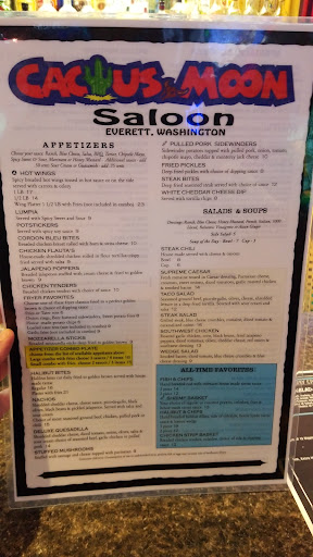 Read moreI live just a block from Cactus Moon, so I go there quite often for my required Margarita's and they don't skip on the booze. I like to turn my Coffee Nudges into dessert and ask for extra whipped cream and cherries and they never hesitate to do this for me. Yum! It's a large saloon with lots of bar seating and a large sunken more quiet area, so I've always been able to get my own large or small table. It's definitely a sports bar with plenty of TV screens. I see a lot of Seahawks fans there on game days. They have darts and golf video game, plus a whole wall of pull tabs behind one side of the bar. I think they have a karaoke night, but I'm not sure. Every single one of the staff that has served me have been friendly and nice. One handsome male server who knows that I'm a regular and often calls me "Honey"or "Sweetheart" which I really like and one time even gave me a hug! Once when my tab came, I was $10 short and he covered it for me, which is so generous. When I tried to pay him back later, he refused to take my money. The same thing happened again, this time $20 and once again my incredible female server AND pride it for me. Later when I went to pay her back, she at first she refused to take my money, however I was so grateful that I insisted that she did. To sum it up the place is really friendly and comfortable with lots of great decorations. My favorite is the I usually there alone, so I like to go there just to talk and interact with other the patrons. They serve appetizers and full meals with daily special's and they bring out your food super-fast. I love Taco Tuesday's as you can get a bunch of hard ones at a time or singles for just $1.50 each and 50 cents more for soft ones. Perfect for when I'm short on money. Friday night is steak night. It wasn't the most tender that I've had but you can't beat the low price. My fav is the huge prime rib special on Sunday night. Salad, clam chowder, a loaded baked potato and the prime rib in small, medium and large. I once had their pot roast special and it was so good that I sent my compliments to the chef. Sometimes she's the one who delivers your food and she's very nice. Definitely check out the Cactus...
