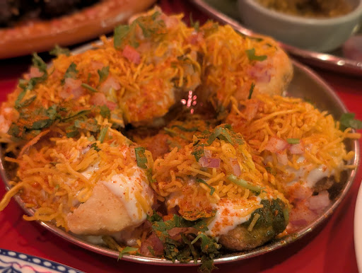 SPDP $13 Toasted puffed up puris stuffed with potato, red onion & cilantro, with sweet yogurt, tamarind & green chutneys & topped with sev (crunchy chickpea noodles). #onebite (vegetarian)