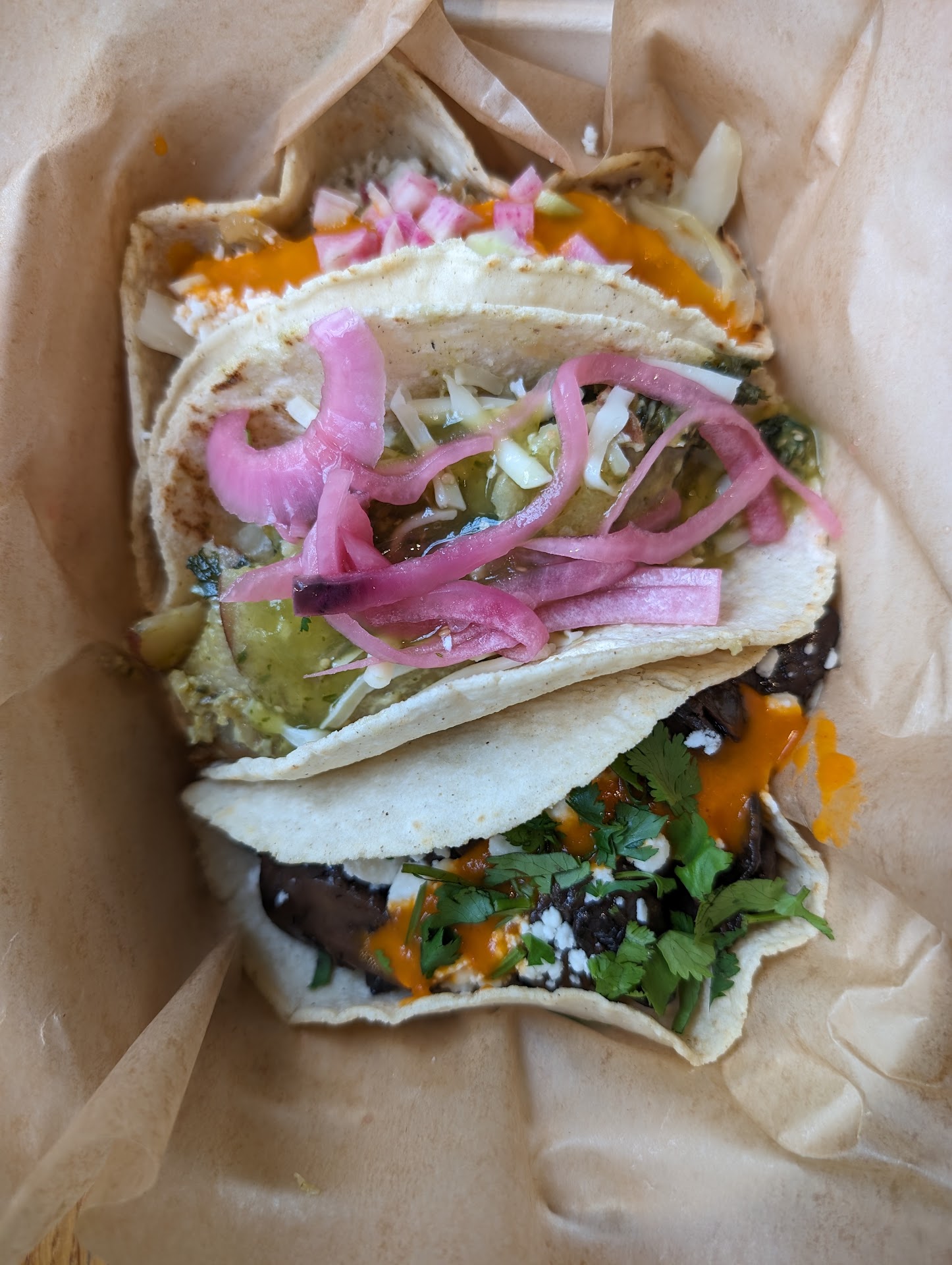 Read moreAll vegetarian and/or vegan tacos and gluten-free for my wife... I can say that I was skeptical about this place for sure. However, the tacos won me over. The three taco deal is almost too much good food and between my wife and I, we tried all the tacos on the menu. Everyone probably raves about the creamy kale and potato taco, and it was certainly good, but the Moroccan carrot taco was the closest winner for us. I would rank the next three after the carrot as the kale-potato, the garlic greens (lots of collards in this one and very good!), then the mushroom one. Got a coffee, too, and it was pretty good as they brew Vigilante there. Definitely didn't hurt that it was beautiful fall day today, so we ate outside by the river rather than staying in the very small restaurant itself. Price was eleven bucks for three tacos, but I'd've been happy with two. Three would be good if you're hungry, but for a regular meal, two was plenty. Def check this place out.
