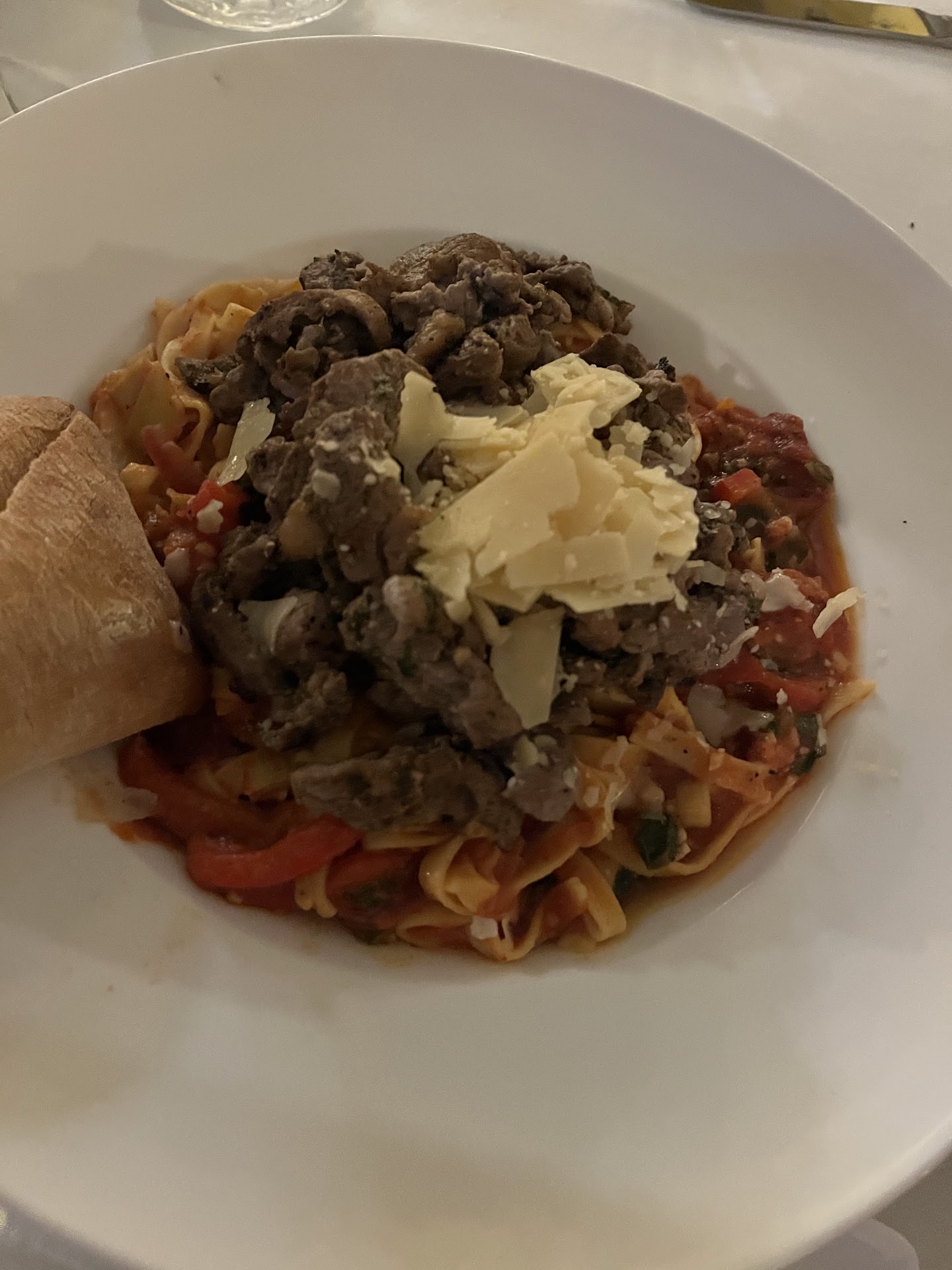 The menu is quite expansive, extending across four pages and three countries / regions of food, but we eventually settled on our selections. My friends both got pasta dishes, one with beef and the other with seafood, and I ordered their insalata tilapia. I was initially intimidated by the idea of a $25 salad, but once I saw the portion size, I understood why the price tag was so high. Each of our plates were massive, with probably 4 or 5 cups worth of pasta or salad. Our entrees also each came with a starter salad and bread (although I'm not entirely sure why my salad came with a starter salad...perhaps the servers just didn't want me to feel left out as my dining partners ate their salads, which is very sweet). Each entree was easily two, maybe three meals, and we could have easily split just one or two of these plates between us and been perfectly fine.