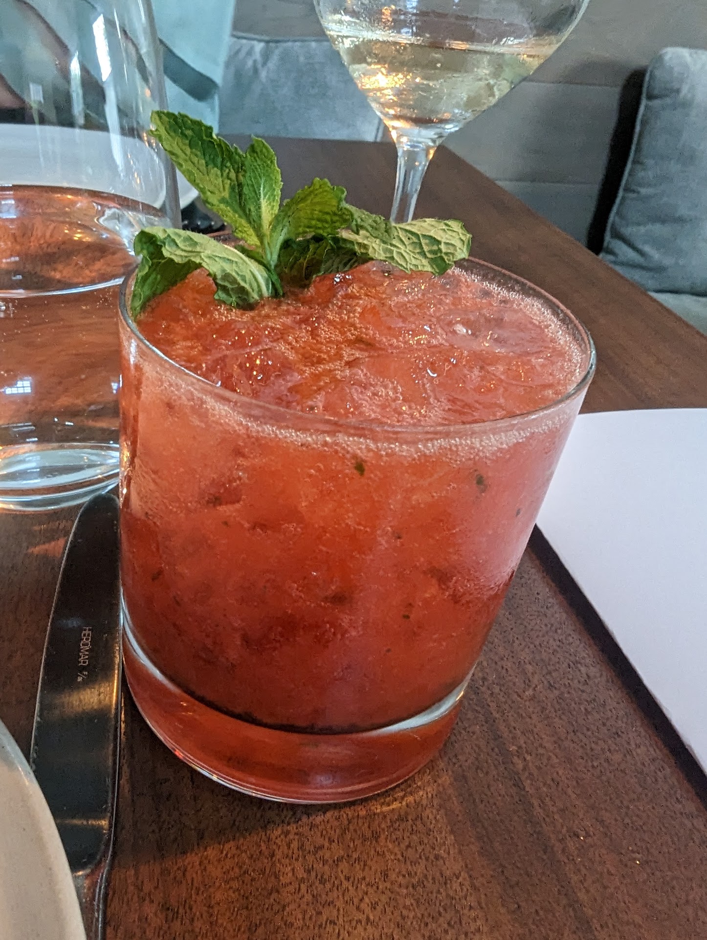 The steak was also completely unseasoned, and the accompanying cherry sauce was an odd pairing—far too sweet for such a fatty cut. The sides were vegetable-based, delicate, and actually quite good, but their scale and style made them feel more suited for a filet rather than such a heavy ribeye. My wife couldn’t eat more than a single piece of her steak, and when her plate was cleared, no one asked why most of her food was untouched. At restaurants of this caliber, that kind of attentiveness is usually expected.
