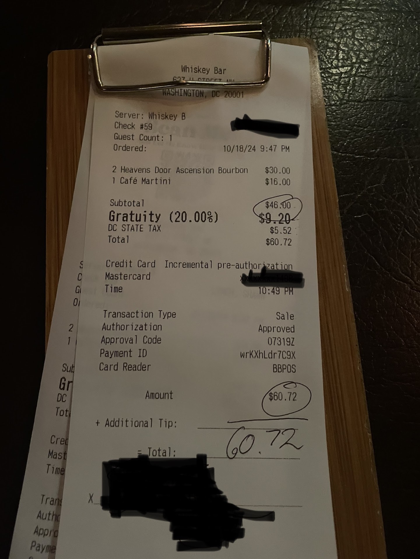 Read moreWas walking down from the rooftop bar and saw the Whiskey Bar sign. Thought we’d pop in for a few. Slightly annoyed at the rooftop on the Automatic (20%) gratuity for obvious reasons, but that’s a DC writ large issue. Of note the rooftop bar calculates the DC tax (10%) before the gratuity. As noted below on the receipt from the Whiskey Bar Basement…. Tax calculation After Gratuity. When asked, the server didn’t have an answer but did say that both bars are owned and managed by same company. Then why the difference? Why am I paying tax on TOP of Gratuity- which should also be Optional? This, and the other fees restaurants add automatically is what will be the downfall of these places. Wouldn’t recommend to visit again until they stop doing stuff like this. Tips should go directly to the server or bartender and should not be automatic. It’s based of service...