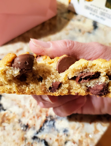 So, hubby and I broke into the cookie; it made me feel a little better spending that much money on a single cookie, being the cookie was so thick. The taste was pretty good, and the texture was not too bad.