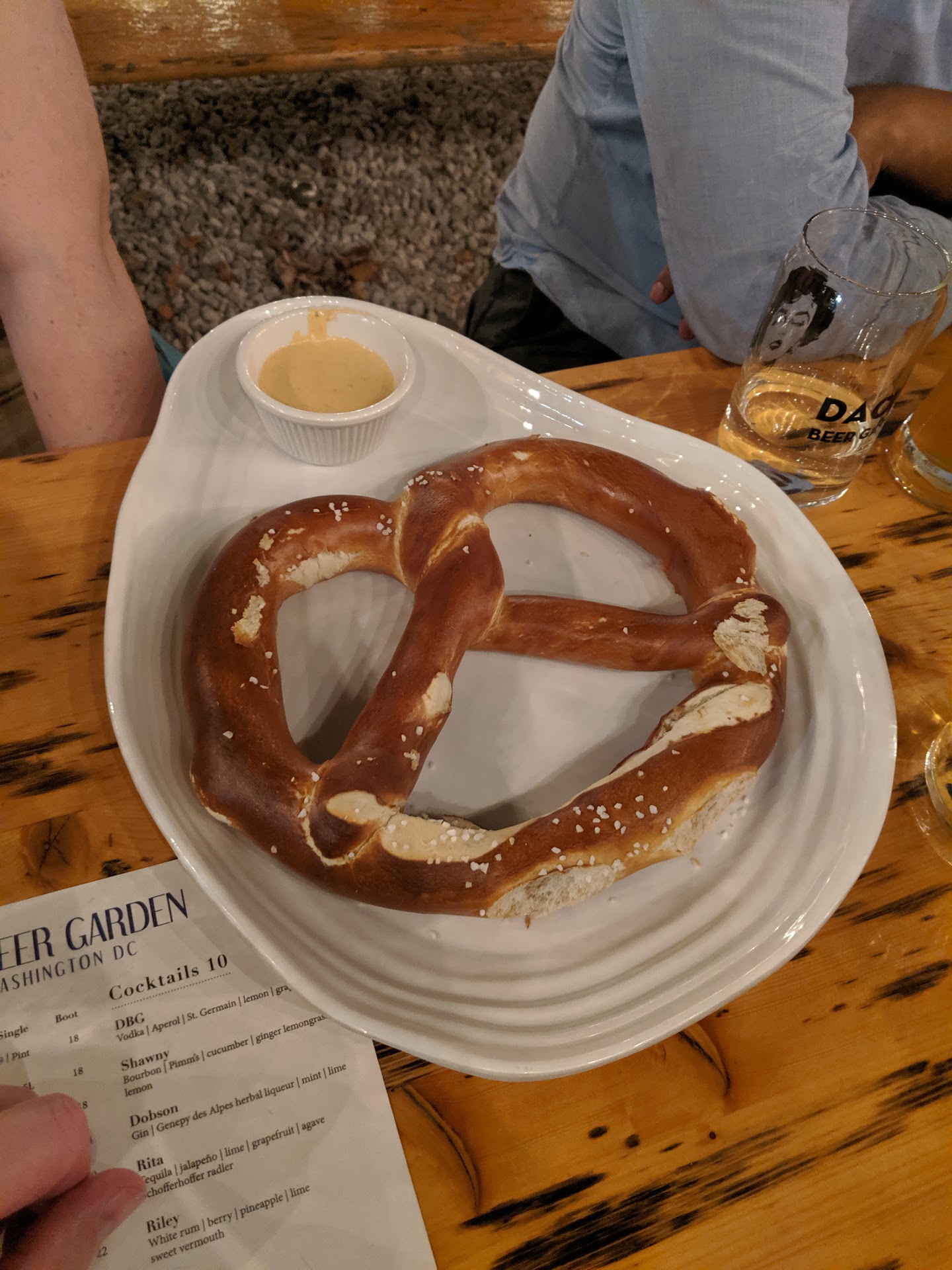 The drink menu is HUGE! Most of their drinks are on tap, but they do have bottles, etc. If you don't love beer, I'm happy to report they have two ciders on tap. One is a dry cider and one is sweeter (Bold Rock's rose cider). Both come in a Dacha Beer Garden glass that people love so much they steal them (there's a sign at the exit asking that you don't take the glasses with you). They also sell drinks in a large glass boot!