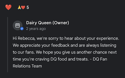 Read moreI really didn't even want to give it a star at all Even for the hated it star I spent $33 on two hamburgers or I'm sorry one hamburger three chicken strips that were small two french fries and two blizzards one small one large for 33 bucks and whenever I asked the kid behind the register if I could get another ranch he told me I had to pay for it after I spent $33 on a hamburger three chicken strips two french fries and two ice creams to me that is absolutely ridiculous ... On top of this we went in there on a motorcycle with helmets in our hands they put our food in a bag and to go after we asked them not to then we had to ask for spoons for the small blizzard and a large blizzard I'm not sure but I'm almost positive that I could train a monkey and a week to do that job and the management they have there and training these kids is absolutely horrible I have owned my business for 12 years and personally I would not let someone work like that for me without me saying something and teaching them the right...